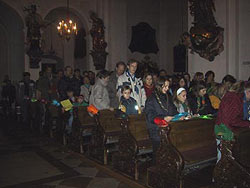 Die verschiedenen Gruppen (S5 - Gnigl, S9 - Richterhöhe, Bergheim, Henndorf, Oberndorf und S4 Mülln) trafen sich an drei unterschiedlichen Plätzen, von denen sie in Fackelzügen hinauf nach Maria Plain gingen. Oben angekommen wurden die letzten Vorbereitungen für die Messe getroffen, jeder suchte sich einen Platz in den - von den Müllner WiWö mit Kronen geschmückten - Bänken, oder in der Empore und dann konnte es auch schon losgehen.