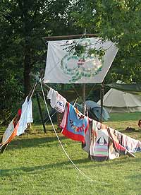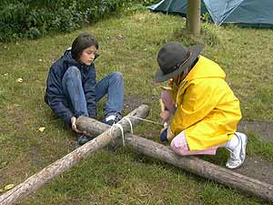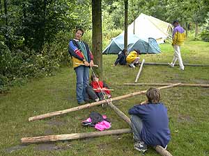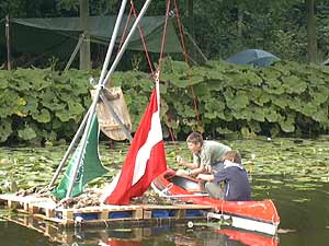 Sofort begannen wir das Lager zu errichten und jede Sparte hatte sein eigenes Seeufer und somit ausreichend Platz für ihre Lagerbauten. Die GuSp zum Beispiel ließen sich sogleich vom Wasser inspirieren und bauten ein Schiff mit selbst gebasteltem Segel.
