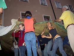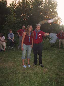Im Rahmen des Lagerfeuers gab es noch eine besondere Attraktion: 5 Leiter und Leiterinnen forderten die Eltern heraus, um die Wette ein Doppelkegelzelt aufzustellen und nach dem o.k. von Schiedsrichter hgk wieder zusammenzulegen. Ich schreibe es nicht gern, aber die Eltern haben gewonnen und zwar mit 14 Sekunden Vorsprung. Weil man danach nicht um Ausreden verlegen sein darf, muss aber gesagt werden, dass die Eltern viel mehr waren, dass einige gestandene Pfadfinder dabei waren und vor allem, dass sie moralische (und auch tatkräftige) Unterstützung von ihren Kindern bekamen.