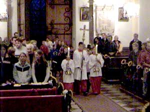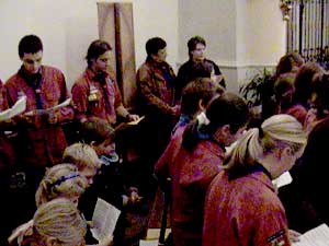 Am Samstag, dem 4. Oktober, fand anlässlich der Feierlichkeiten zur Weihe der neuen Orgel eine Jugendmesse in der Müllner Kirche statt, die von allen Jugendgruppen der Pfarren Mülln und Maxglan (Pfadfinder, Jungschar, Ministranten) gemeinsam gestaltet wurde. Der Beitrag der Müllner Pfadfinder war vor allem, in bewährter Weise für die musikalische Umrahmung zu sorgen. Kapellmeister war diesmal Georg (Gecko) Gensluckner, weil unser Standardgeneralmusikdirektor Haggi (war mit Julia auf einem RaRo-Projektseminar) verhindert war. Gecko meisterte seine Sache gemeinsam mit Konzertmeister Christoph Sander hervorragend und konnte den knapp vierzigköpfigen Chor nach einer letzten Probe im Heim zu Höchstleistungen motivieren.