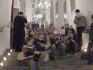 Nach der Messe wäre ein Fackelzug geplant gewesen, der aber witterungsbedingt buchstäblich ins Wasser fiel. Daher versammelte sich die Jugend am Ende im Schein unzähliger Kerzen zu einer abschließenden Geschichte auf der Kirchenstiege.