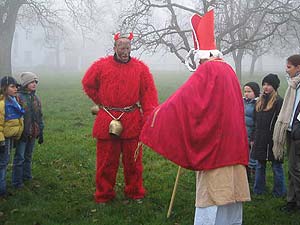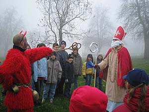 Samstagvormittag bekamen wir Besuch vom Krampus und vom Nikolo, die sich nicht einigen konnten, wessen Arbeit denn nun leichter zu bewältigen sei, so dass sie beschlossen, ihre Rollen zu tauschen (Krampolaus und Nikopus). Doch so einfach war es gar nicht, in die Rolle des anderen zu schlüpfen, deshalb holten sie sich Ratschläge bei den Kindern, die verschiedene Stationen einer Krampus-und-Nikolaus-Schule absolvierten. Unsere WiWö und GuSp bewiesen ihre Geschicklichkeit beim Stabhochsprung mit dem Bischofstab und dem Kranzlstechen mit den Krampushörnern, lernten Kekse zu backen und zu naschen und die Krampusglocken melodisch zu läuten, trainierten beim Kraxnlauf und balancierten die Bischofsmütze, schürten das Höllenfeuer und entzifferten Geheimschriften aus dem Goldenen Buch. Letztendlich mussten sich Nikolaus und Krampus eingestehen, dass der Arbeit des anderen Respekt gebührt und sie doch am besten können, was sie schon immer gemacht haben.