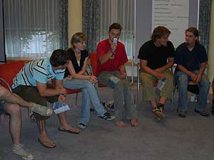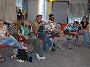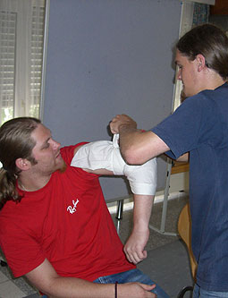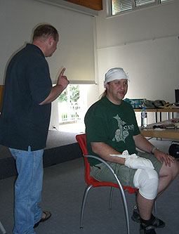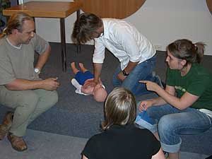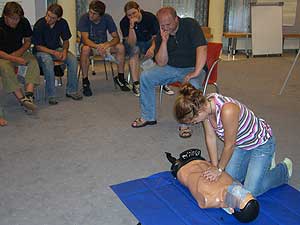 Praktisch als eine der letzten Vorbereitungen für die heurigen Sommerlager fand am 8. und 9. Juli für die Leiter und auch einige RaRo ein eigener Erste Hilfekurs im Pfadfinderhaus statt. Unterrichtet wurden wir von Werner Nini vom Roten Kreuz (immer wieder von unserem Sani Haggi kompetent assistiert), der uns in sehr anschaulicher und humorvoller Weise die Grundzüge der Ersthilfe beibrachte. Wir können nun 110 kg schwere Verletzte aus Autos bergen, Motorradfahrer enthelmen, Kinder und Erwachsene reanimieren (zumindest bei Puppen können wir das perfekt), starke und schwache Blutungen mit entsprechenden Verbänden versorgen und vieles mehr. Vor allem aber war viel Raum, um diverse mögliche kleinere und größere Wehwehchen, wie sie bei Pfadfinderveranstaltungen auftreten können, besprechen zu können.
