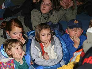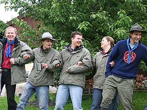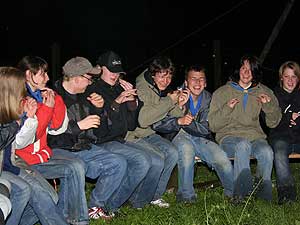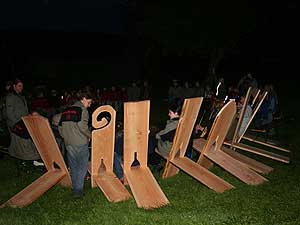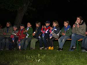 Nachdem das Abendessen (eine riesige Grillerei) beendet war, gab es noch eine Generalprobe der Sommerlageraufführungen, die wir heuer in Schottland zu ehren der dortigen Gastgeber aufführen wollen, wonach natürlich noch das Lagerfeuer mit Sang und Klang das Ende des Lagers einläutete.