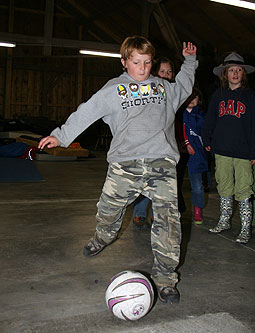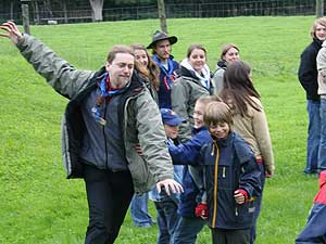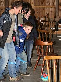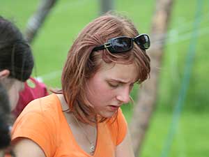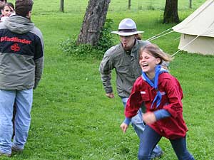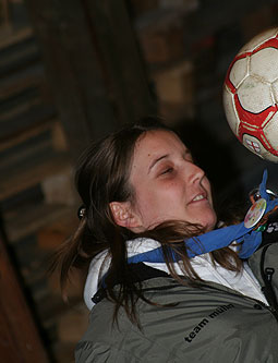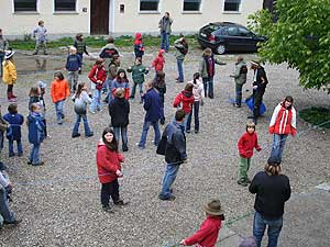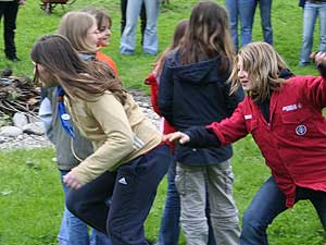 Nachdem das ganze bisherige Lager von stufeninternen Aktivitäten dominiert wurde, widmete sich die ganze Gruppe am Sonntag dem Thema Fußball. In diesem Fall spielten wir Kegelfußball, bauten und spielten mit einem Riesenwuzler, bewiesen unsere Geschicklichkeit beim Durchlaufen eines Fußballhindernisparkurs und versuchten - teilweise mit enormer Hartnäckigkeit - mit dem Fußball ziel zuschießen.