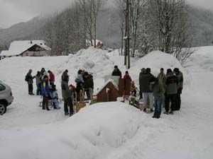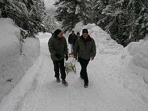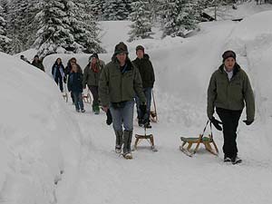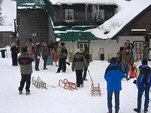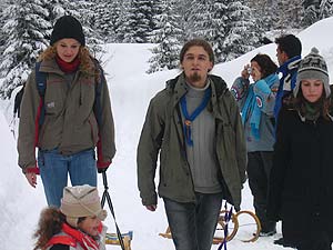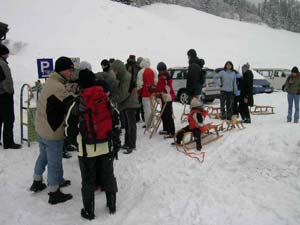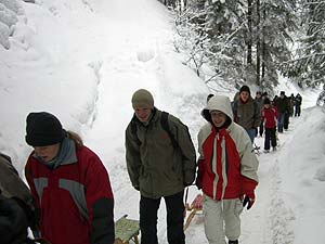 Am Samstag, den 4. März 2006 machte sich eine kleine (aber feine) Schar von 35 Müllner Pfadis zusammen mit Eltern und Freunden in die Tiefbrunnau auf. Dort angekommen wagten wir den atem(be)raubenden Aufstieg zur Schafbachalm. Während dem Aufstieg - auf dem durch hohe Schneewände begrenzten Weg - bat sich eine gute Möglichkeit in aller Ruhe (sofern man genung Puste hatte) über "Gott und die Welt" zu sprechen. Gezeichnet vom anstrengenden Aufstieg freute sich (fast) jeder auf das nicht-alkoholische oder alkoholische, durstlöschende Getränk in der Hütte.