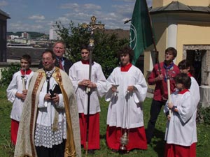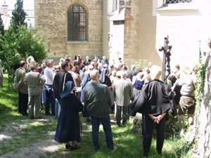 Mit der Segnung des Wassers und der Besprengung der Gemeinde beim Volksaltar begann die feierliche Prozession begleitet von Gebeten zur „ Hl. Kreuzkapelle.“
