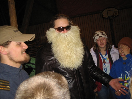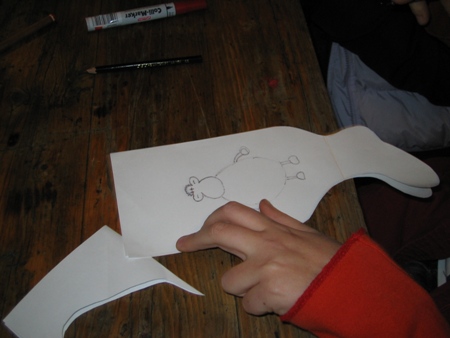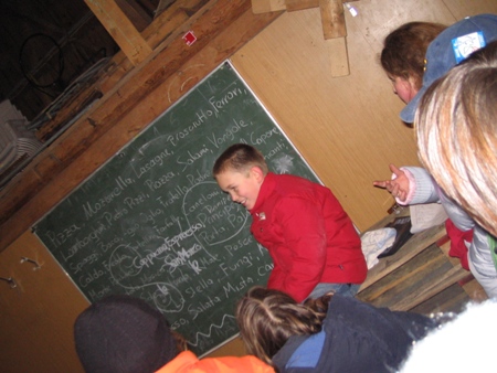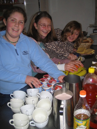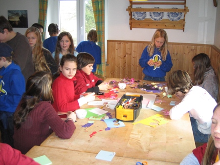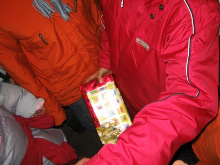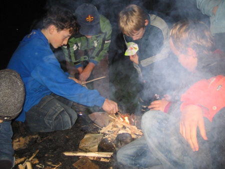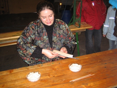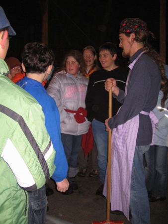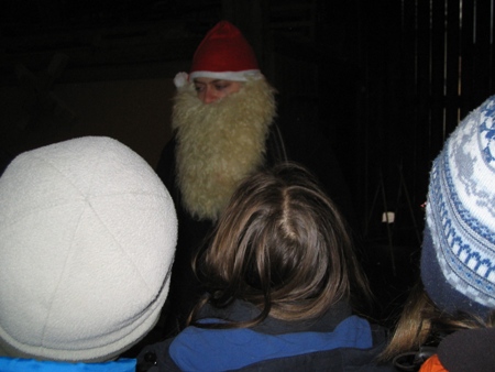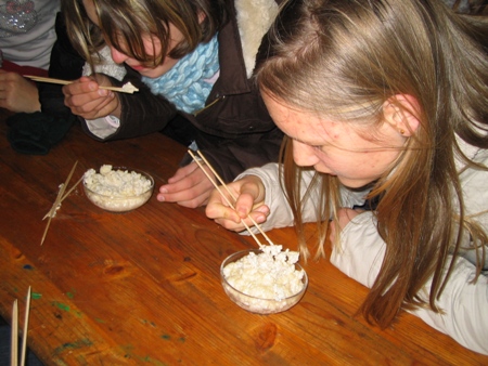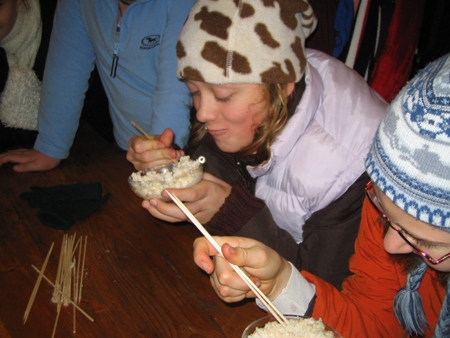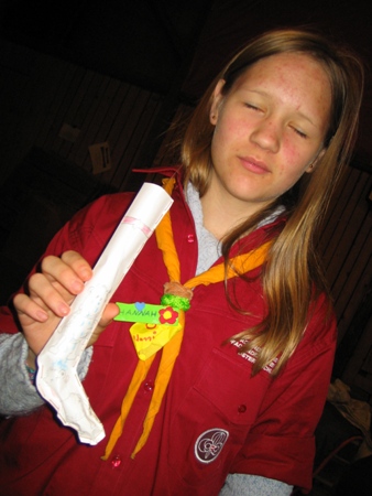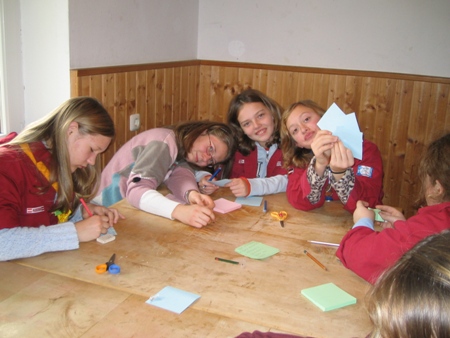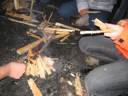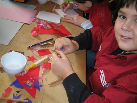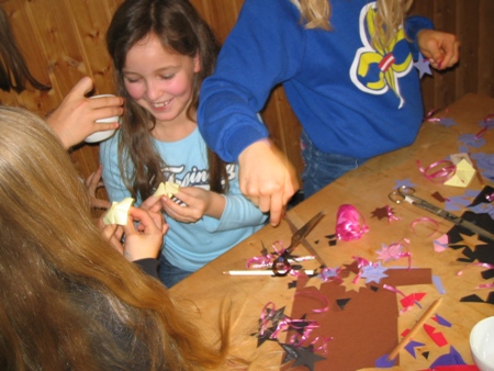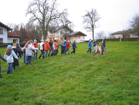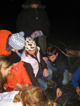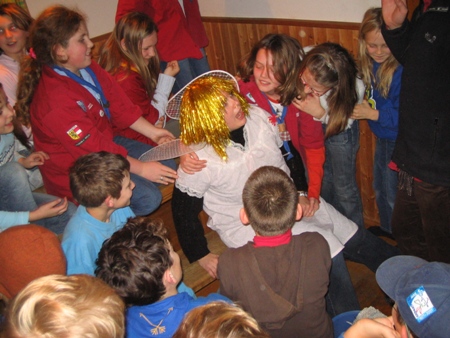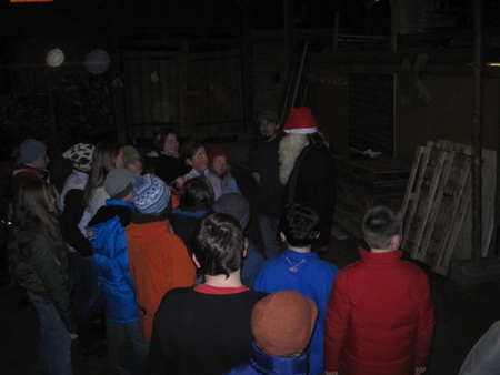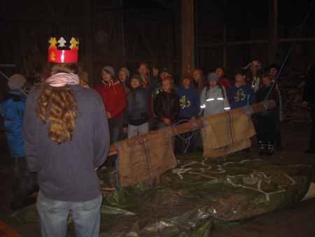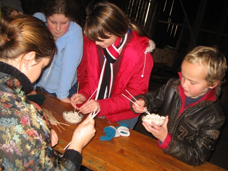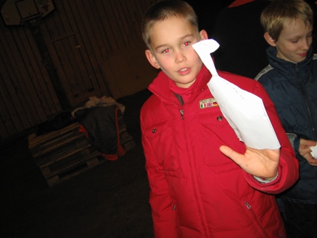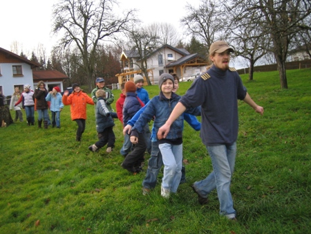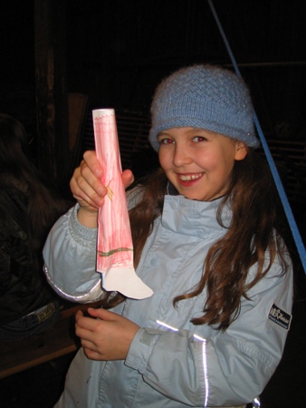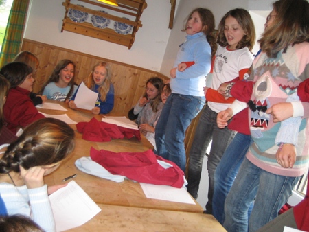 Erste Station war Norwegen. Santa Claus, der dortige "Geschenkelieferant" zu Weihnachten, wollte uns allerdings erst dann helfen, wenn wir uns in der schwierigen, weihnachtsmännischen Disziplin des "Schornsteinwuzelns" unter Beweis gestellt hatten. Der erhaltene Hinweis brachte uns nach Japan, wo mit Stäbchen Milchreis gegessen wurde. Und weiter ging es in die USA. Ganz nach amerikanischer Tradition bastelten wir dort Socken, die, so erklärte uns der coole, mit Sonnenbrille ausgerüstete Weihnachtsmann, in der Weihnacht aufgehängt, am nächsten Morgen voller Süßigkeiten sein sollten. Nächster Stopp der X-mas Airline war Russland, wo Väterchen Frost seinem Namen alle Ehre machte. Ihn fror fürchterlich, so dass unsere GuSp nach Pfadfindermanier mit einigen geübten Handgriffen ein Feuer errichteten (zumindest einige ;-) ) und er sich daran aufwärmen konnte. In Spanien ritten die Kinder angefeuert durch die Heiligen Drei Könige auf einem Kamel Rodeo, und in Italien sangen sie für die Befana Weihnachtslieder auf Italienisch. Letztlich stellte sich aber heraus, dass die Geschenke in Österreich waren.