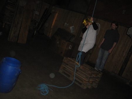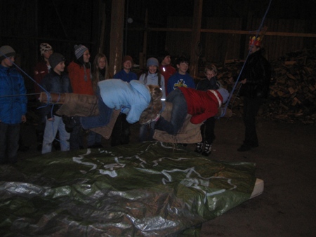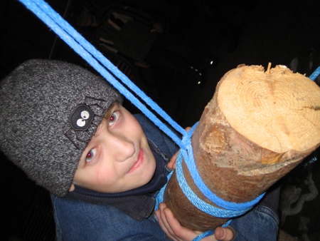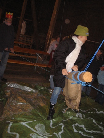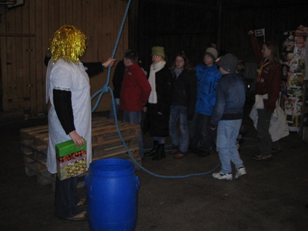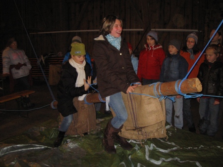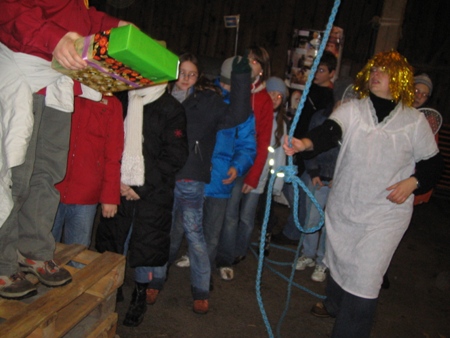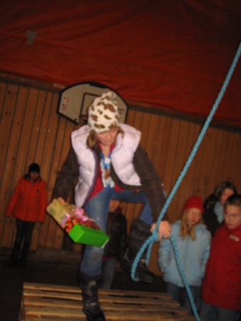 Abschließend bewiesen sich die Kinder als ideale Aushilfshelfer (sollte einmal ein Engel ausfallen) für das Christkind, indem sie seilschwingend Packerl in ein Ziel warfen.