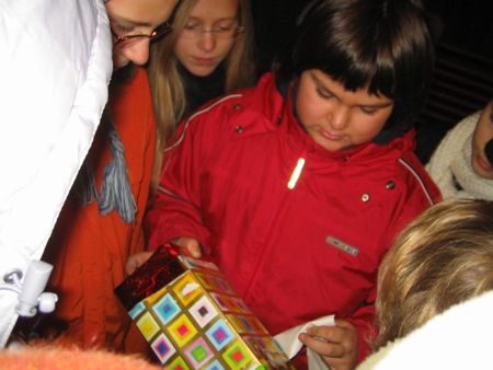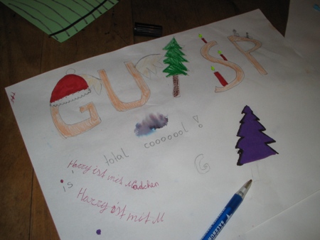 Nachdem wir am Samstagvormittag gesungen und gebastelt hatten, machten wir dann am Nachmittag mit dem Christkindl Bekanntschaft. Dieses hatte nämlich als Folge eines unbeabsichtigten Zusammenstoßes mit einer Fensterscheibe (keine Vogelsilhouetten-Aufkleber, die die Kollision verhindern hätten können) nicht nur die Geschenke verloren, sondern auch vergessen in welchem Land sich das tragische Missgeschick ereignet hatte. Unsere GuSps, hilfsbereit wie sie nun einmal sind, machten sich gleich auf den Weg, um die Geschenke zu finden und dem Christkind zurückzubringen.
