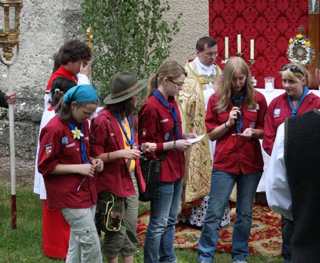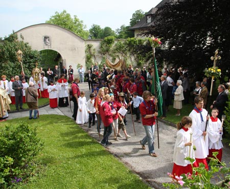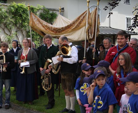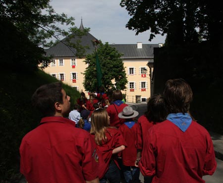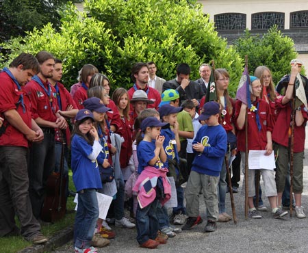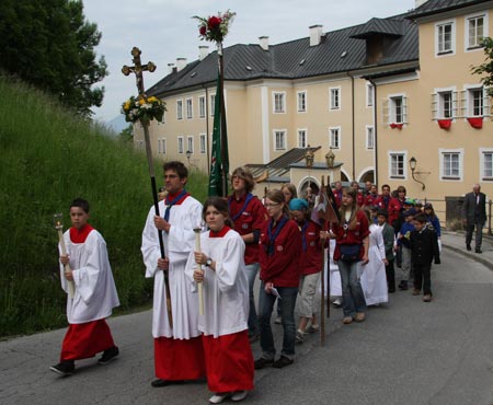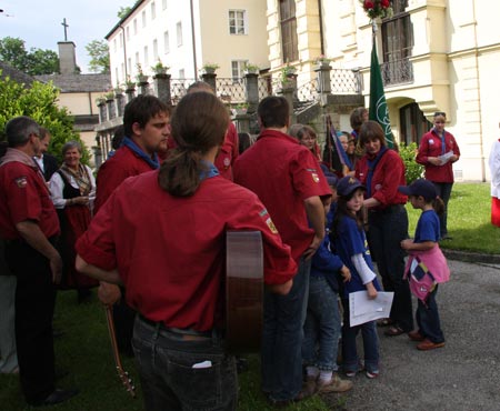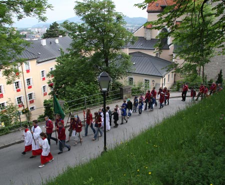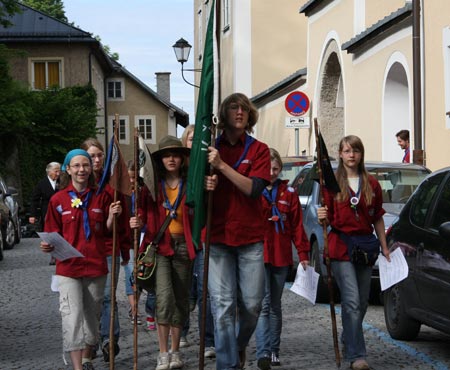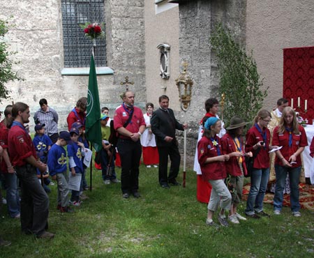 Bei schönem Wetter konnten wir auch in diesem Jahr am Fronleichnamsfest der Müllner Pfarre mit knapp 40 Pfadfindern teilnehmen. Wir schon in den Jahren davor übernahmen wir einzelne Teile der gesanglichen Gestaltung, sowie den dritten Altar des Umzugs über den Mönchsberg auch inhaltlich. Die schöne Feier durch den Abt Johannes Perkmann von Michaelbeuern und Pfarrer Franz Lauterbacher wurde auch durch die überraschend große Feiergemeinde noch festlicher.