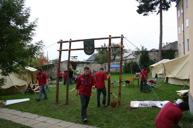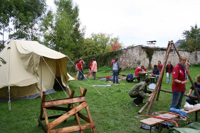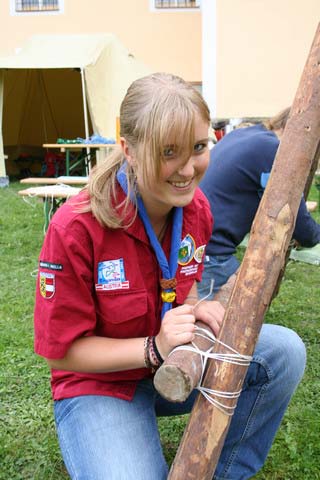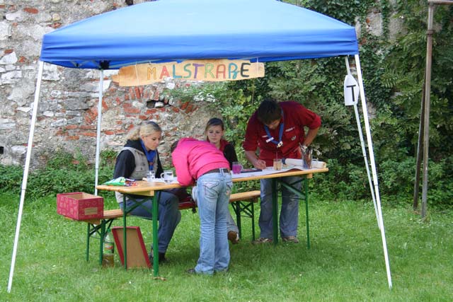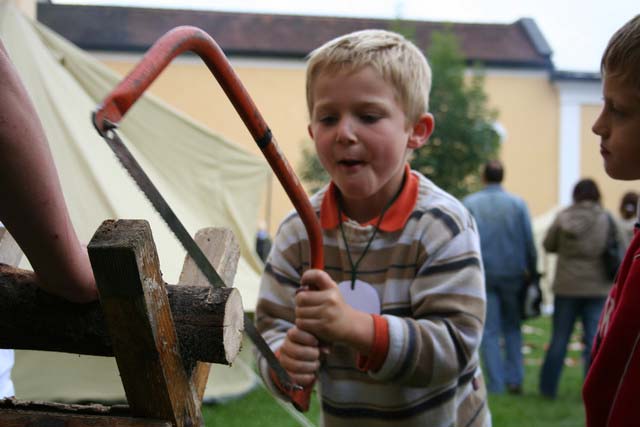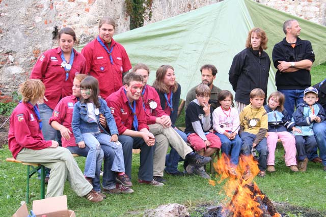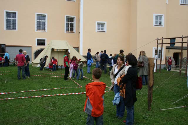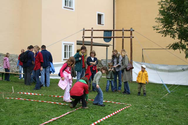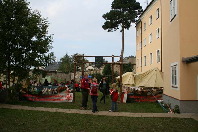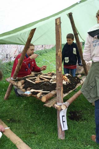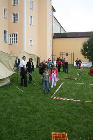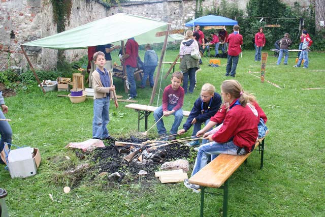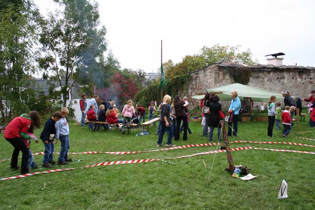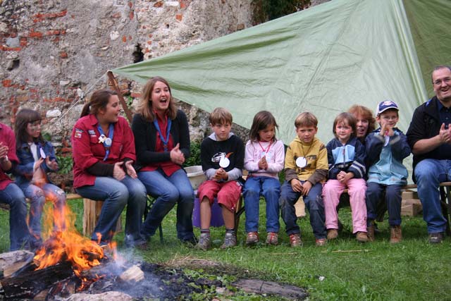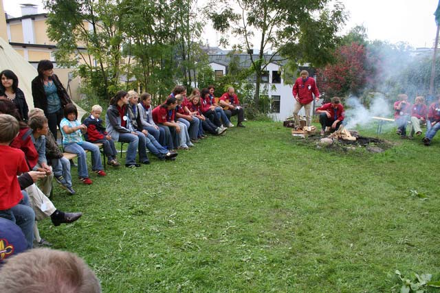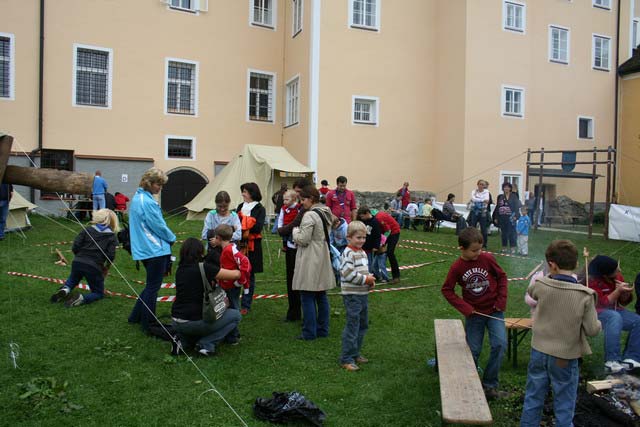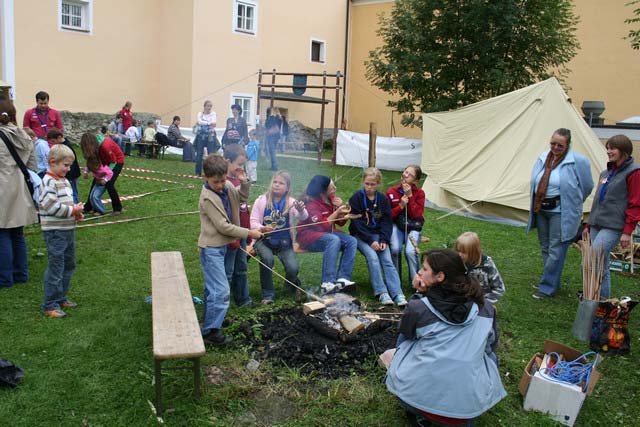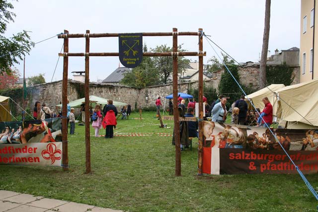 „Du sag mal, was macht ihr denn eigentlich so bei den Pfadfindern?“ Tja, eigentlich ein sehr gute und berechtigte Frage. Wir stellen Zelte auf und sind viel in der freien Natur?! Keine sehr erschöpfende Auskunft für jemanden, der keine Ahnung davon hat, was denn Pfadfinder nun wirklich so tun. Und deshalb fassten wir den Entschluss, heuer unseren ersten „Tag der offenen Tür“ zu veranstalten, wo wir in sehr pfadfinderischen Station zum Besten geben wollten, was wir unter Pfadfinderei so verstehen. Um ein möglichst großes Zielpublikum zu erreichen, verteilten wir bei unserer inzwischen jährlich wiederkehrenden Werbeaktion auch Flugblätter für den ersten „Tag der offenen Tür“, an dem vom Schauzelt und Merk-Kim über Feuermachen und Steckerlbrot auch Dinge wie Wettsägen, Sackhüpfen, Seilziehen und Kinder schminken dabei sein sollten. Kurz gesagt ein einfach pfadfinderisches Eröffnungsfest. Und so harrten wir der Dinge die da kommen sollten. Und es kamen tatsächlich sehr viele Kinder und Eltern, in deren faszinierten und interessierten Gesichtern wir den wahrscheinlichen Erfolg dieses Tages ablesen konnten. Einige fixe Anmeldungen und sehr viele Gespräche können wohl als Erfolg gesehen werden. Mit einem kurzen aber auch sehr gelungenen Lagerfeuer ließen wir diesen Tag ausklingen, der uns wohl noch lange in Erinnerung– und wir hoffen auch in der Erinnerung unserer Besucher – bleiben wird. Weiters hoffen wir, dass wir unseren Gästen mit diesem Tag nun auch hinlänglich erklären konnten, was denn nun Pfadfinder eigentlich so machen! Kurz: wir machen zusammen einfach tolle Dinge und entdecken und fördern unsere Fähigkeiten.