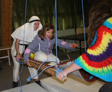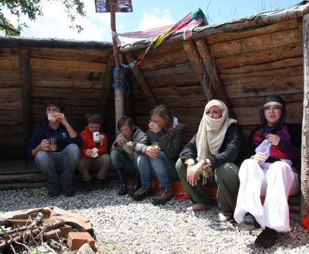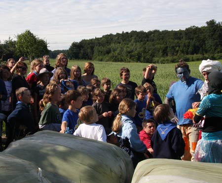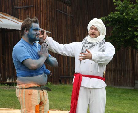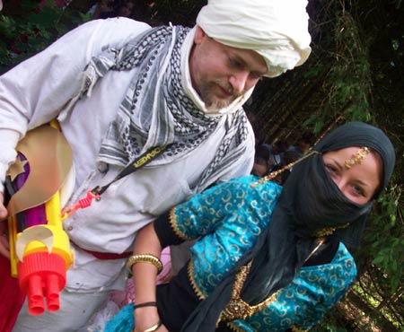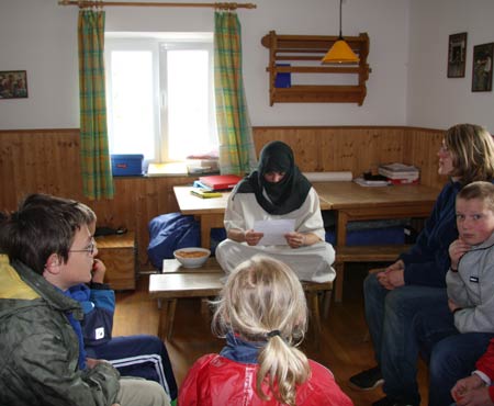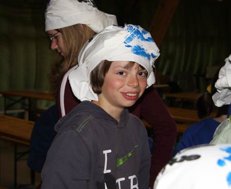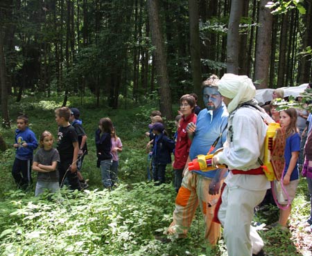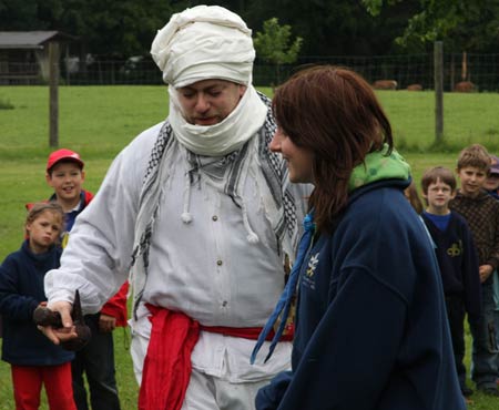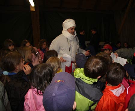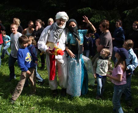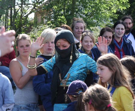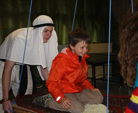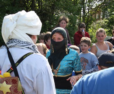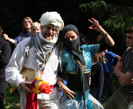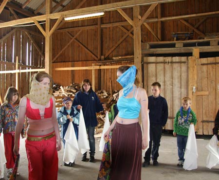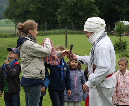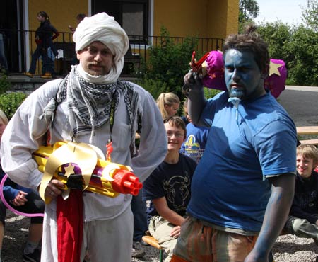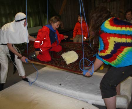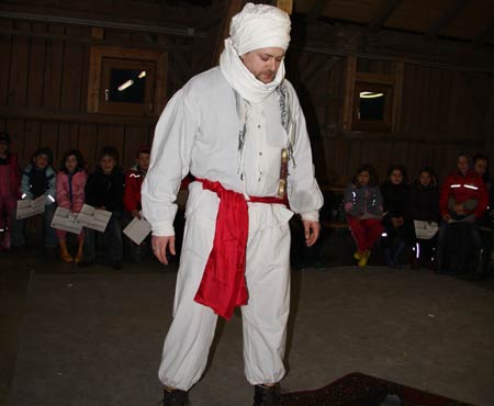 Am nächsten Tag konnten wir Ibrahim seine Gegenstände überreichen und er befreite sogleich seinen Dschinni aus der Wunderlampe, um mit ihm weiter nach der Prinzessin zu suchen und den bösen Teppichmann zu besiegen. Der Dschinni erklärte uns, dass auf einem großen Bazar irgendwo im fernen Orient eine Superwaffe existiere, mit der der Teppichmann mit dem unaussprechlichen Namen besiegt werden könne. Allerdings sei diese Waffe in einer gut verschlossenen Kiste aufbewahrt, und die Schlüssel befänden sich irgendwo auf dem Bazar. Wir sicherten ihnen wieder unsere Hilfe zu und der Dschinni zauberte uns auf den Bazar, wo das Handeln und Feilschen begann: Es mussten unter anderem Turbane gebastelt, fernöstliche Gewürze neu geordnet, orientalische Tänze gelernt, schwierige Rätsel gelöst und allerlei arabisches Brauchtum kennengelernt werden bis wir endlich in den Besitz der Schlüssel kamen, um die Kiste mit der Waffe zu öffnen.