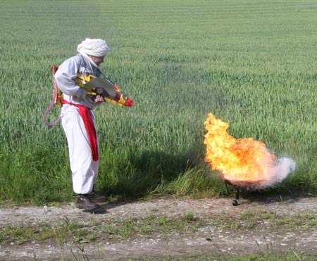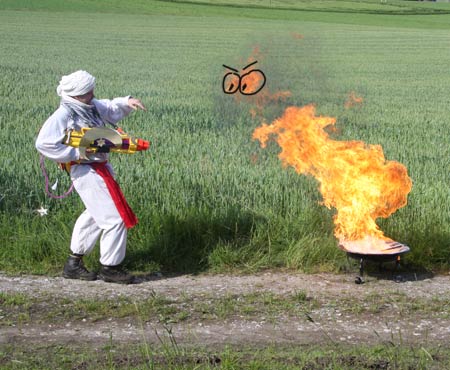 Mit der Waffe ausgestattet machten wir uns zu dem Ort auf, an dem Ibrahim und der Dschinni den Teppichmann vermuteten, in der Hoffnung, den Aufenthaltsort der Prinzessin zu erfahren und den Bösewicht zu besiegen. Doch leider konnte er bei einem ersten Versuch entwischen, allerdings wurde eine geheime Fährte sichtbar. Wir folgten der Spur, und tatsächlich führte sie uns zur gefesselten Prinzessin. Nachdem wir sie befreit hatten, machten wir uns mit Ibrahim an einen zweiten Versuch, den bösen Teppichmann mit dem unaussprechlichen Namen zu besiegen. Und diesmal gelang es uns auch: der Schurke konnte mit der Wunderwaffe endgültig in die Flucht geschlagen werden.