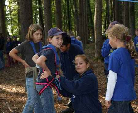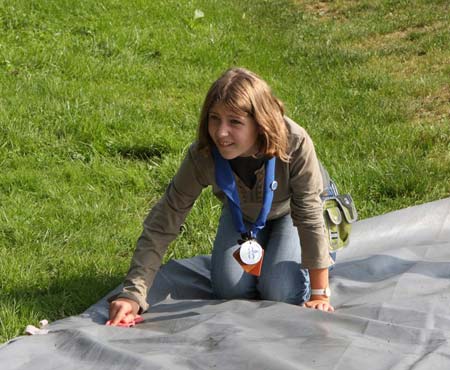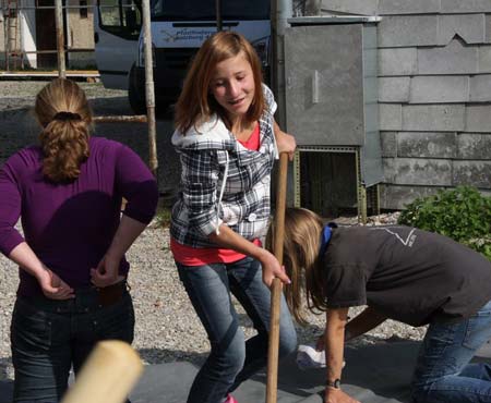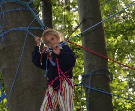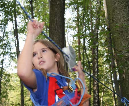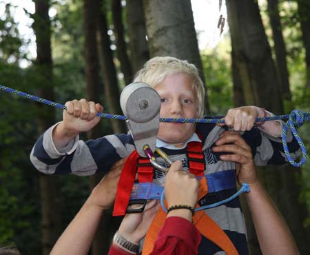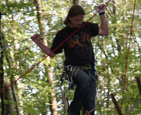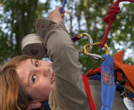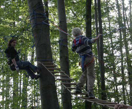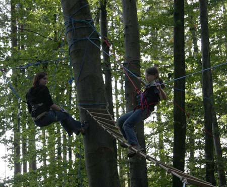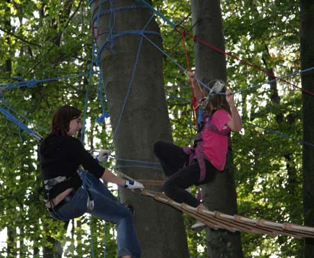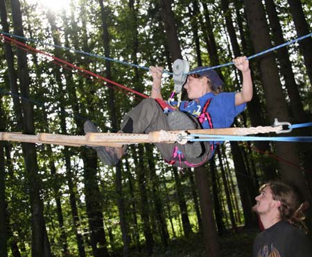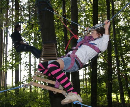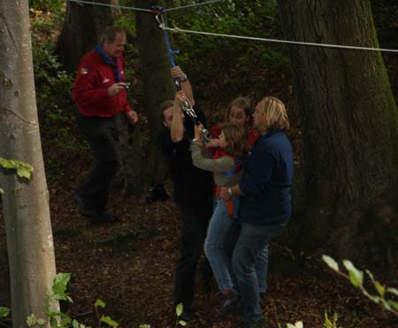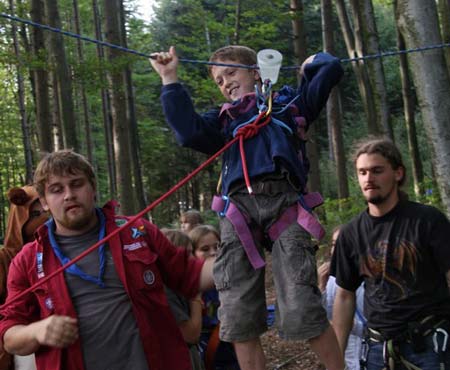 Am großen Graben: Nur wenige Meter weiter hatte inzwischen das bewährte Technikteam der Gruppe in einer atemberaubenden Pioniertat eine Seilbahn über den gefährlichen Abgrund am Rande des Höllerersees gebaut. Mutige WiWö machten eine waghalsige Probefahrt und damit den schwungvollen Schritt in die GuSp-Stufe, in der sie mit einem Megaplakat herzlich willkommen geheißen wurden. Übrigens war zuvor Pia, die beim Einstieg in die Seilbahn behilflich war, bei der NASA in Schwerelosigkeit trainiert worden.
