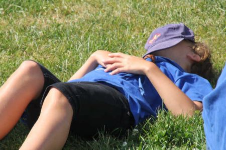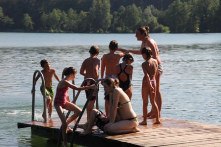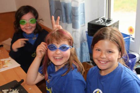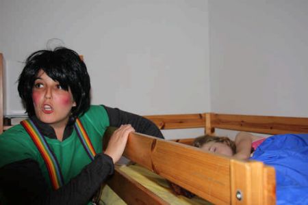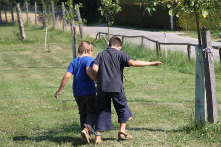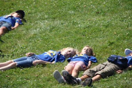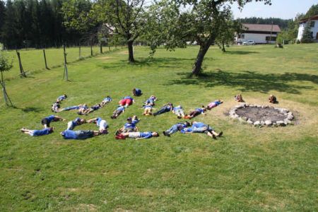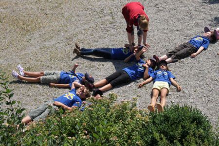 Der nächste Morgen wurde mit einem Fotoshooting verbracht, dass sehr auf die Rückenmuskeln ging. Aber das Ergebnis ist wirklich sehenswert ;-) Dann wurde noch das Teamverhalten der WiWö gestärkt bevor es dann zur Entspannung und Abkühlung ab zum See ging. Als wir uns wieder auf den Rückweg machten konnten wir unseren Augen kaum trauen!!! Da saß doch tatsächlich Puck in der Wiese und weinte... Hilfsbereit wie die Pfadis sind fragten wir natürlich gleich was denn los sei??? Sie erklärte uns sie habe schon wieder Streiche bei den anderen Wichteln gemacht, diesmal aber VIEL VIEL SCHLIMMER, und vielleicht erhält sie nun ihren richtigen Namen Amona nie wieder zurück. Das konnten wir natürlich nicht zulassen und wir beschlossen Puck zur Seite zu stehen und ihr zu helfen die Sachen wieder in Ordnung zu bringen. So ging es auch gleich auf zum Wichtelvolk der Tillenwichteln denen sie die Farben weggenommen hatte und die nun ganz weiß waren, was sie totunglücklich machte. Doch den WiWö gelang es das Tillenwichtel wieder bunt zu bemalen und es wieder mit Puck zu versöhnen! Ein Problem war also gelöst, aber es mussten noch andere Wichtelvölker besänftigt werden. Wir beschlossen, uns um diese erst am nächsten Tagen zu kümmern, denn nun war Schlafenszeit angesagt.