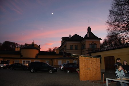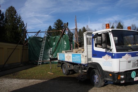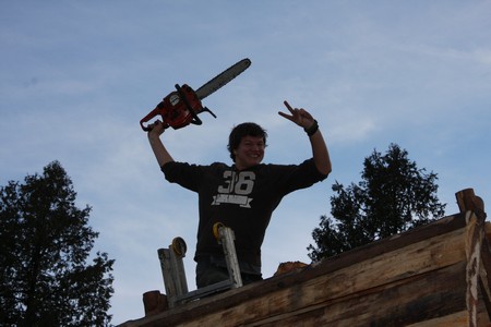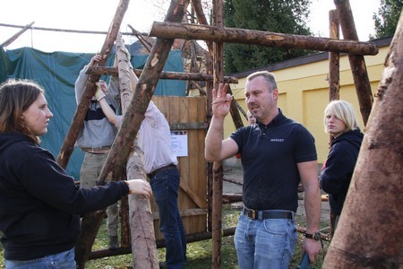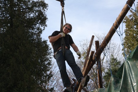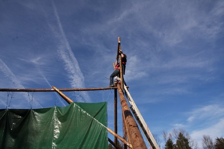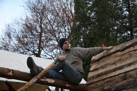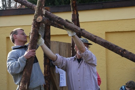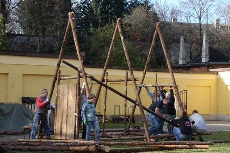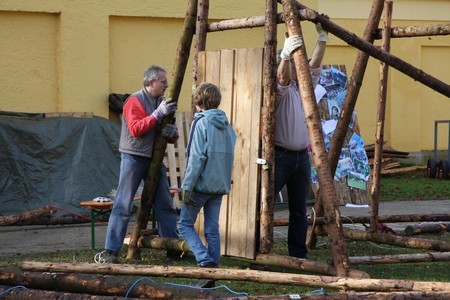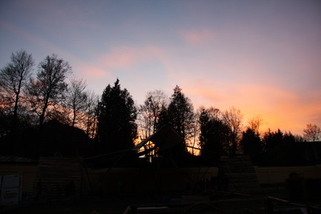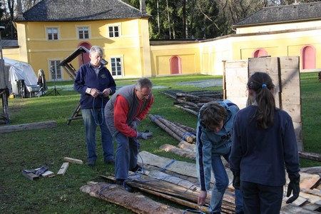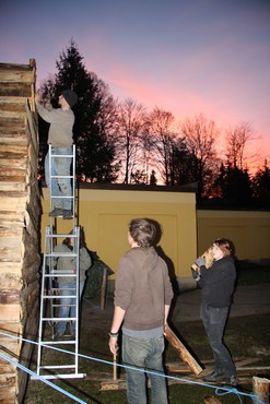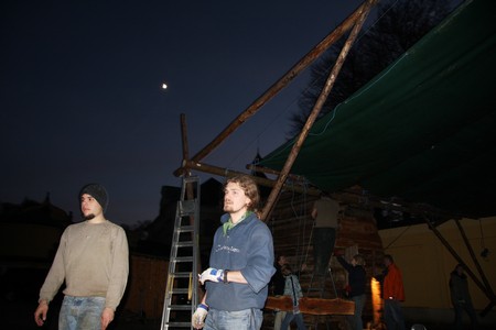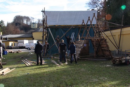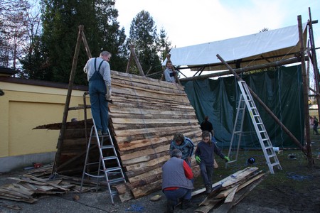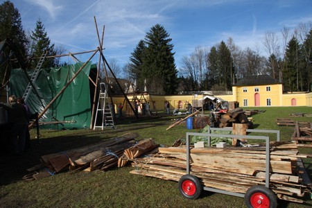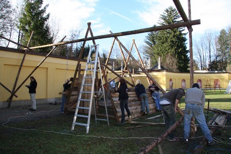 Wir schafften an einem Tag die Hauptkonstruktion und die Hütten fertigzustellen. Für Sonntag blieb noch ein wenig Aufräum- und Nachbesserungsarbeit, aber jetzt ist alles für den Adventmarkt bereit.