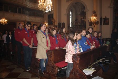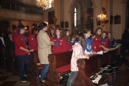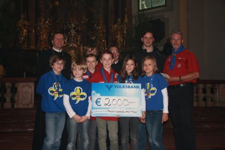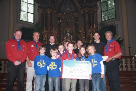 Nach dem Umzug, der aufgrund des Schlechtwetters in der Kirche stattfand, konnten wir dem Pastoralassistenten David Lang einen Scheck über € 2.000,- als Spende für sein Projekt „Armut teilen“ überreichen. Es ist uns besonders wichtig, dieses pfarrcaritative, lokale Projekt zu unterstützen um direkt der armen Müllner Bevölkerung zu Hilfe zu kommen. Baden Powell (der Gründer Pfadfinder) schrieb in seinem Abschiedsbrief an „seine“ Pfadfinder: „Versucht die Welt ein wenig besser zu verlassen, als ihr sie vorgefunden habt“ – Dies stand auch für uns hier an erster Stelle. Die Spende ist ein großer Teil unseres Verdienstes vom Adventmarkt in Hellbrunn, den wir schon im Vorfeld fixiert und einem sozialen Projekt gewidmet haben. Dass wir schließlich das tolle Müllner-Projekt „gefunden“ haben, freut uns natürlich sehr.