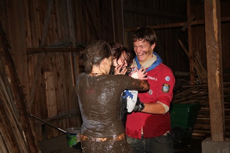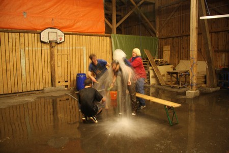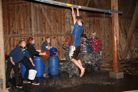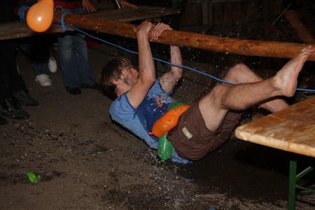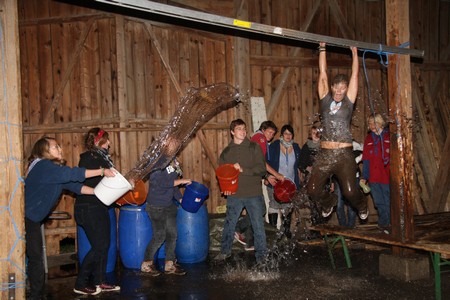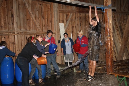 Wie immer am schlimmsten erwischte es dann die RaRoanwärter. Zwar wurde auf dringende Intervention durch die Gruppenleitung die eigentliche Überstellung entscheidend entschärft. Lediglich eine kleine Wippe musste überwunden werden und die Wasserspende war diesmal rein symbolisch. Allerdings ergab eine sofort im Anschluss durchgeführte Inspektion, dass alle drei nunmehrigen Jungraro (so genannte „Gulus“), das rote Buch nicht dabei hatten (das sie noch gar nicht bekommen hatten, Anm. d. Red.), was allerdings das schlimmste Vergehen in der RaRostufe darstellt. Also wurde eiligst ein Schubtruhnal einberufen. Für alle, die nicht wissen sollten, was das sei, eine kurze Erläuterung: Es handelt sich um eine Art Gerichtsverhandlung im Zeichen der Schubtruhe, welche den Müllner RaRo seit Jahrzehnten heilig ist. Praktischerweise sind Richter und Staatsanwalt ident und in der Regel die Stufenleitung selbst. Beisitzer sind Ausgereifte, also altgediente RaRo, die wissen, dass die Entscheidung des Oberrichters unumstößlich ist. Auch die Pflichtverteidiger bemühen sich selbstverständlich verzweifelt um ihre Mandanten, nämlich dass sie – die ja schuldig sind –, auch fairerweise schuldig gesprochen werden. Lästige Berufungen kommen daher auch so gut wie nie vor, weil sie ohnehin nur zu einer Verdoppelung der Strafe führen können. Sämtliche Sitzungen sind öffentlich und für alle Nichtangeklagten ein Gaudium. Besagtes Publikum darf manchmal dann auch noch an der Bestrafung mitwirken, wie auch diesmal. Langer Schreibe kurzer Sinn: Die Deliquenten wurden unter der Oberaufsicht von Drillsergeant Pia mindestens so schmutzig und so nass wie alle ihre unglücklichen Vorgänger und Vorgängerinnen in früheren Jahren. Allerdings war das auch die Eintrittskarte in die früher unzugängliche RaRobar, weshalb die Nacht für diese Überstellten ohnehin ganz kurz wurde.