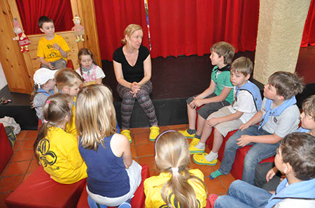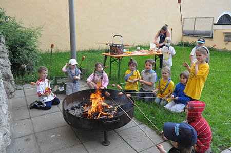 Am 2. Juniwochenende trafen sich 13 Biber und 2 Leiterinnen nun schon zum dritten Mal zur Biberübernachtung. Bei schönem Wetter spazierten wir zum Spielzeug Museum wo wir schon freudig erwartet wurden und als kleines Willkommensgeschenk jeder eine Murmel bekam. Nach kurzem Schuh aus- Crocs an- Tausch ging es auch schon weiter in die Kreativwerkstatt. Dort angekommen ging es los mit Basteln: Ein eigenes Memory-Spiel. Ca. 70 Paare bemalten und verzierten die fleißigen Biber. Bevor wir uns noch ein wenig das Museum anschauten, kamen wir den Genuss von einem spontanen Kasperltheater das die Kinder frei improvisiert aufführten. Danach wurden Holztürme gebaut, Autogefahren (natürlich mit Sicherheitshelm) und mit den Murmeln gespielt. Zu guter Letzt schauten wir uns noch die Eisenbahn im 2. Stock an. Nach neuerlichem Schuhtausch spazierten wir wieder zurück zum Pfadiheim nach Mülln. Da wir beim Basteln und Spielen schon sehr viel Energie verbraucht haben war es Zeit uns zu stärken. So konnten wir schon kurze Zeit später leckere Knacker mit Semmeln genießen. Den Durst löschten wir mit Saft und auch Gemüse fehlte bei unserem Biberfestmahl nicht. Nach einigen Spielen im Garten war es Zeit unser „Bett“ alias Schlafsack und Isomatte herzurichten. Nachdem jeder ein gemütliches Plätzchen gefunden hat und sich alle gewaschen haben, schlüpften wir in die Schlafsäcke um beim Film schauen einzuschlafen.