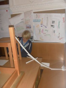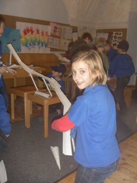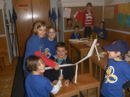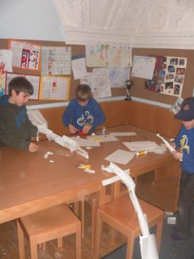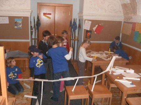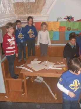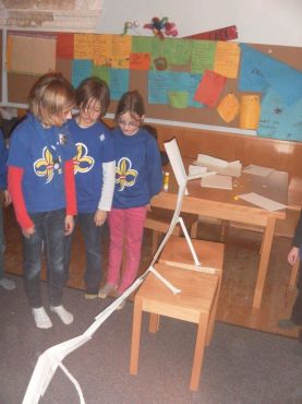 Nachdem das Regenwetter keine Heimstunde im Freien zuließ, gab es Indoor-Action. Dabei musste jedes Rudel, innerhalb einer Stunde, eine Kugelbahn aus Papier, Kleber und Tixo bauen, was uns allen viel Spaß bereitete. Die Resultate können sich wirklich sehen lassen, wie die Fotos beweisen.