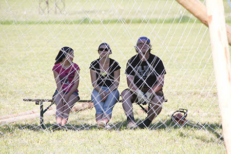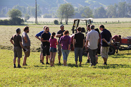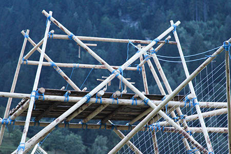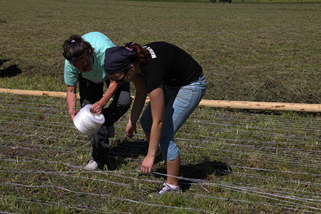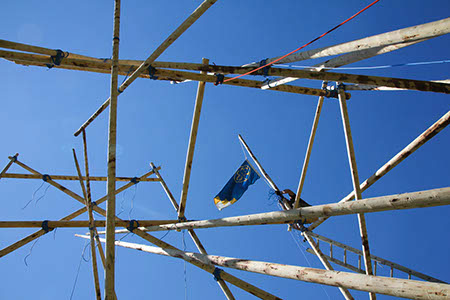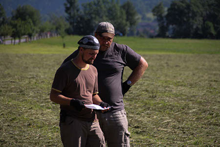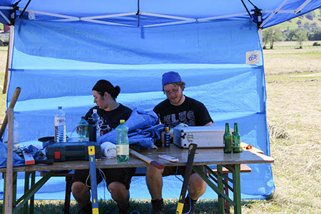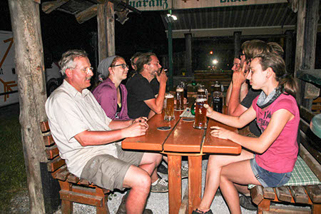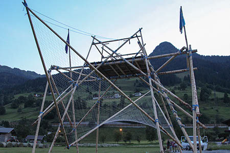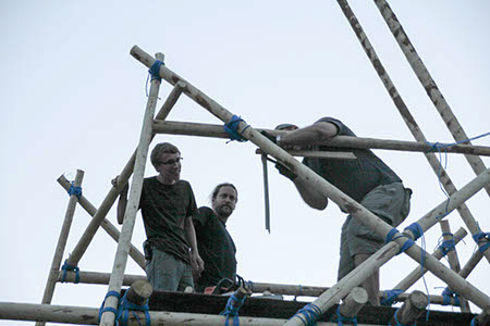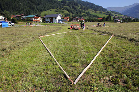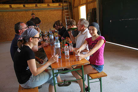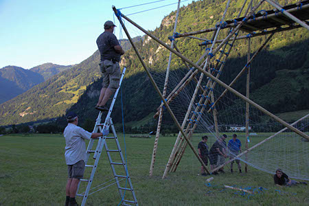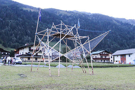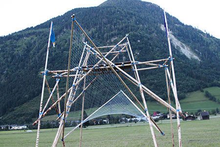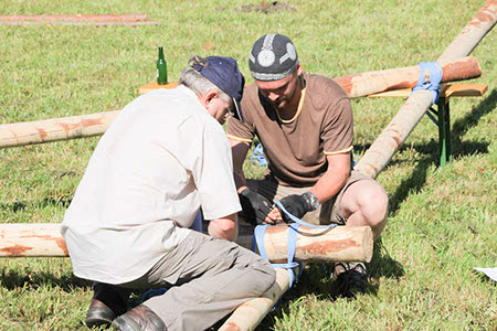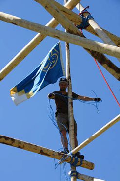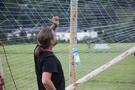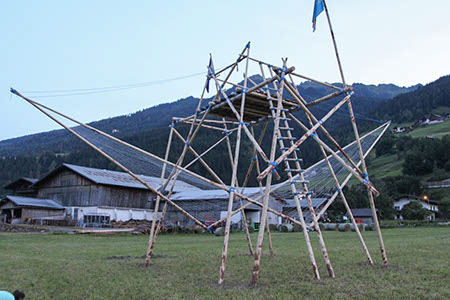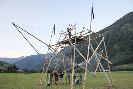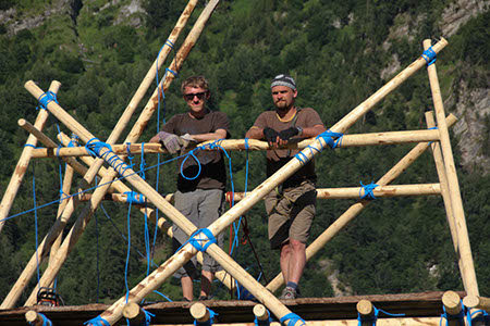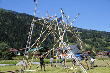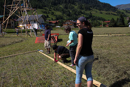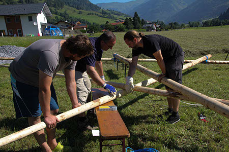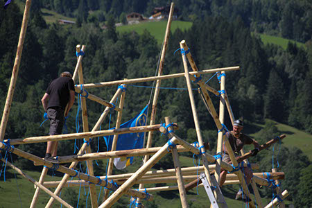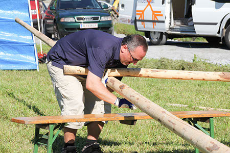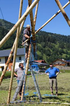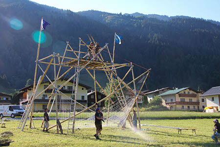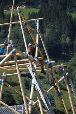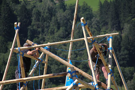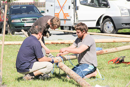 In der Früh noch mit angenehmen Temperaturen wurden schon gleich gebunden, gesägt und geflochten. Beim Aufstellen des ersten Teils mussten wir kurz feststellen, dass ein paar mehr Leute nicht geschadet hätten ... Nichts desto trotz schafften wir es mit vielen Getränken und ebenso viel Schweiß, dass zu Mittag das grobe Gerüst des Lagertors schon fertig war. Keine Minute zu früh, denn um diese Zeit brannte die Sonne dann doch ziemlich unerbittlich herunter und 33 grad machen uns schon zu schaffen. Am Nachmittag verstrebten wir alles und montierten schlussendlich auf noch die "Raute" als optisches Highlight ins Lagertor. Erschöpft aber durchaus zufrieden lehnten wir uns um 21:00 Uhr zurück und stießen auf unser gelungenes Bauwerk mit einem isotonischen, biologischen Hopfenblütentee an und ließen uns eine leckere Schmaranz-Jause schmecken.