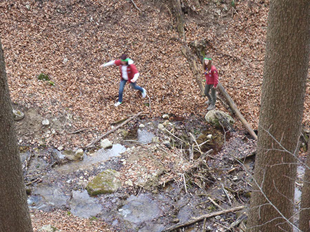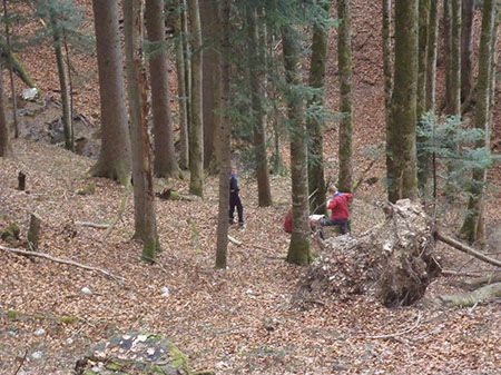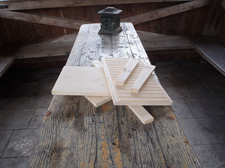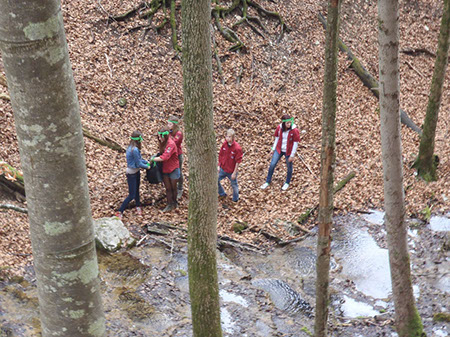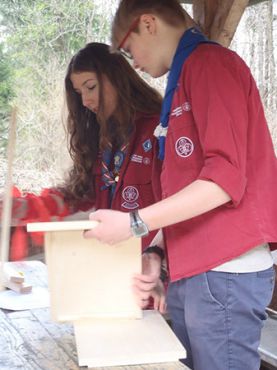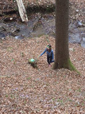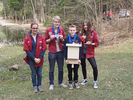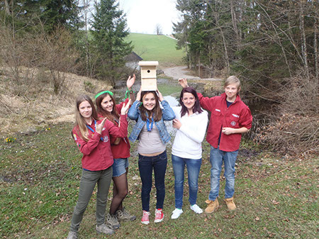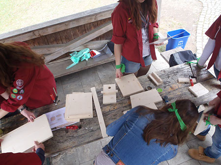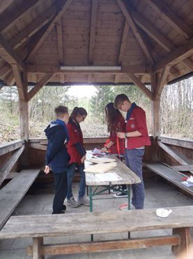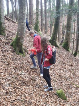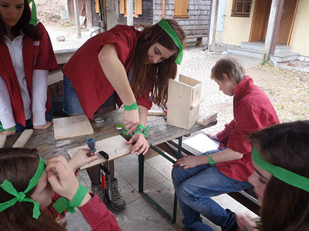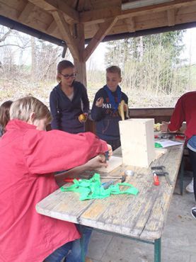 Am ersten Tag haben wir eine Schnitzeljagd in dem Wald gemacht, um in zwei Gruppen Bauteile für jeweils einen Fledermauskasten und ein Vogelhaus zu suchen.