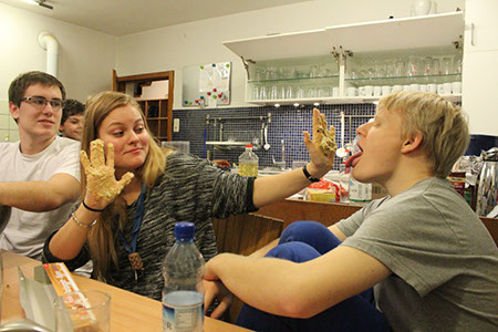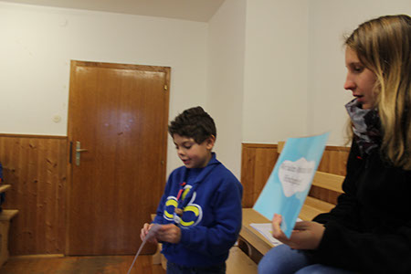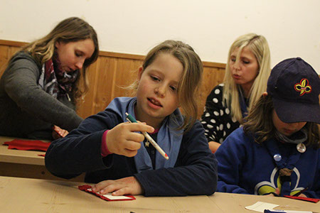 „Na eh ganz klar“, würde die Kinder sagen. „Der hat unsere Hilfe gebraucht. Santa war in Zeitstress und Gedichte schreiben ist nicht seine Stärke. Er brauchte für die Konferenz mit dem Christchild, der Hexe Befana und dem Weihnachtsmann ein Gedicht, das die Bräuche in Amerika erklärt. Das hat er uns in seinem deutsch-englischen Brief geschrieben. Um das Gedicht schreiben zu können, mussten wir erst die Bräuche kennenlernen. Wir backten amerikanische Cookies, bewältigten als Rentiere einen Geschenk-Ausliefer-Hindernislauf und bastelten Socken. Unsere Erlebnisse schrieben wir dann in ein Gedicht, legten dieses am Abend mit einem Teller Kekse und einem Glas Milch vor das Haus. Am nächsten Tag bedankt sich Santa Claus für die Hilfe und füllte unsere Socken mit einer typisch, amerikanische Zuckerstange. Aber gesehen haben wir den Santa leider nie. Zum Abschluss unseres Lagers verzierten wir noch Postkarten um Spenden für die medizinische Versorgung in Nepal zu bekommen. Die Postkarten haben zwar nichts mit dem Santa zu tun, aber die sind sehr schön geworden.“