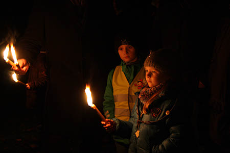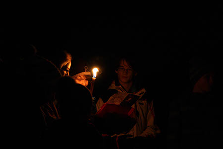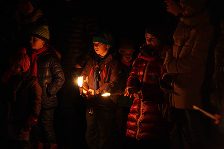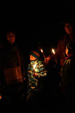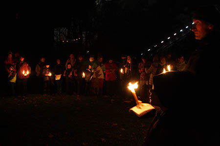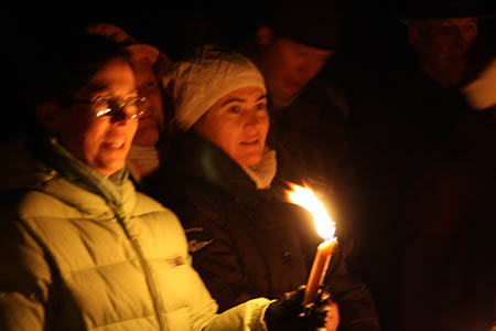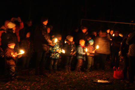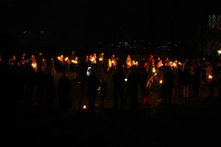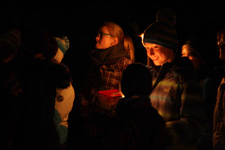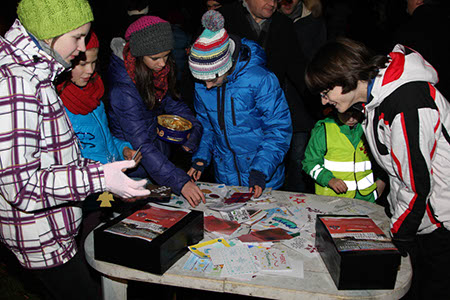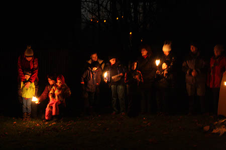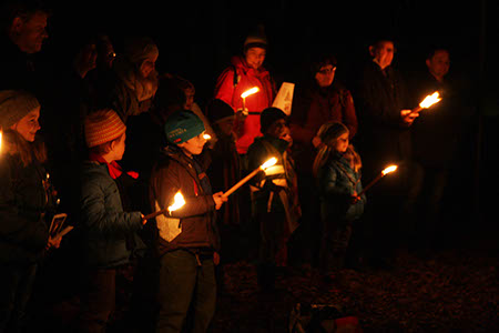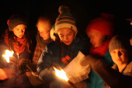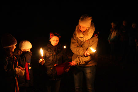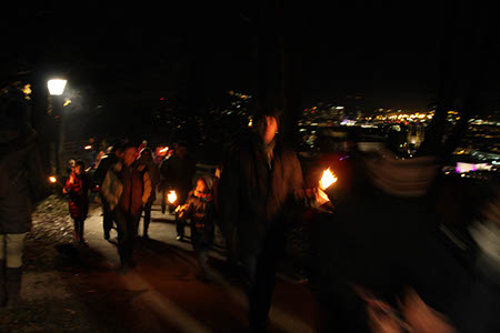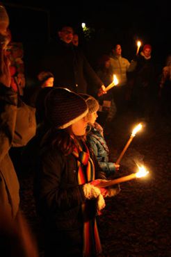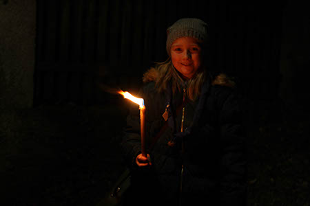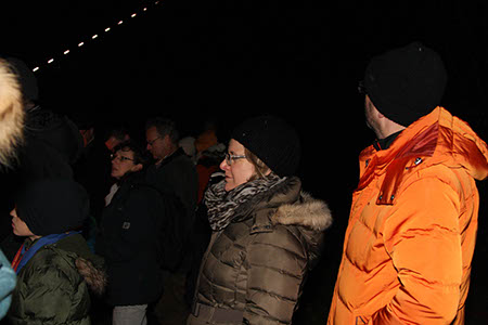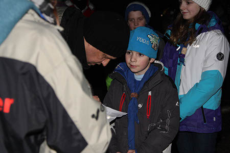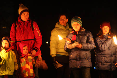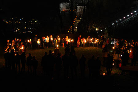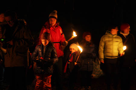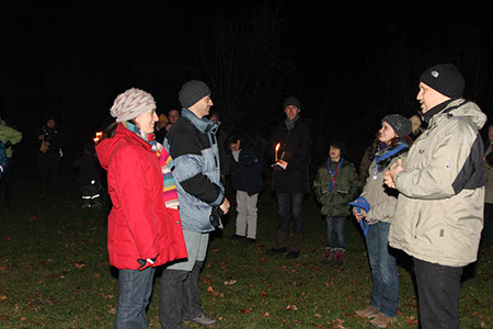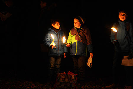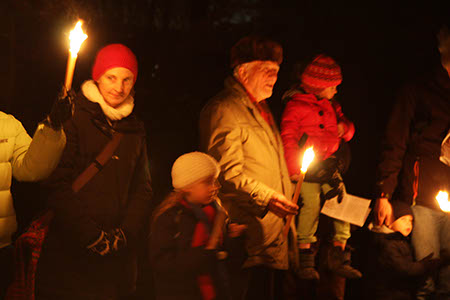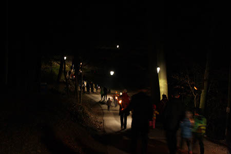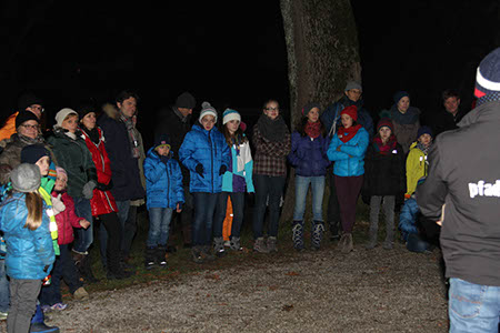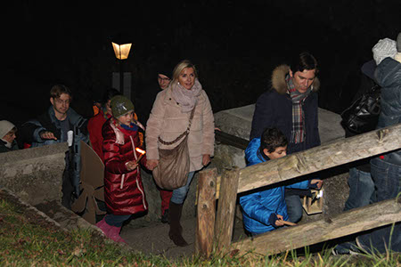 Der Startpunkt der Reise war am Spielplatz hinter der Müllner-Kirche wo mit einleitende Worte von Haggi und die Ausgabe von Fackeln die Wanderung offiziell begann. Besonders erfreulich war, dass der romantische Fackelwanderzug mehr als 100 Teilnehmer umfasste. Bei - über der Strecke verteilten - Stationen erhielten wir zu Beginn durch die Biber einen Einblick in die „typisch österreichische“ Familie zu Weihnachten.