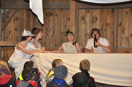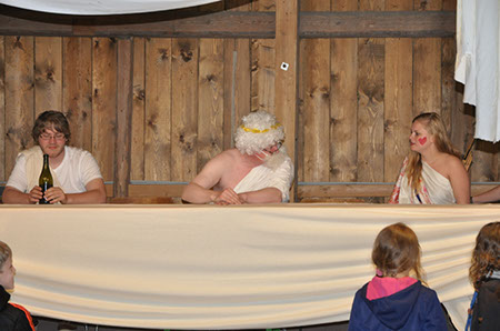 Die Kinder halfen den verschiedensten Göttern am Nachmittag daher bei einer Vielzahl von Aufgaben, um ein wenig „Göttlichkeit“ zu erlangen: Sie malten im Wettkampf mit Apoll, lernten von Ares das Bogenschießen, wurden von Demeter und Aphrodite geschminkt, bewältigten Artemis‘ Hindernisparcours, wuschen wie Herkules den Stall oder halfen Hermes, eine alte Schrift des alten Demokraten Ραροβάρ zu entziffern. All dies machte die Kinder erfahren genug, dass Hephaistos ihnen half, spezielle Münzen zu schmieden.