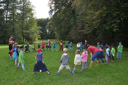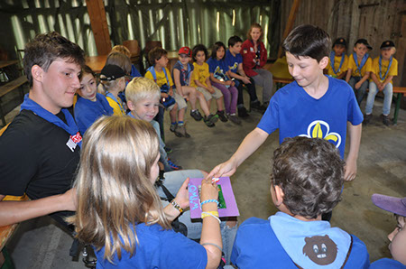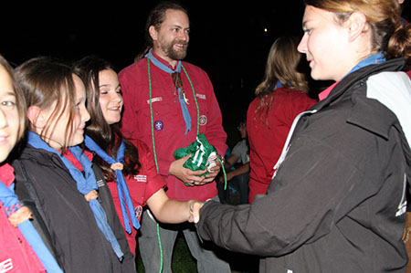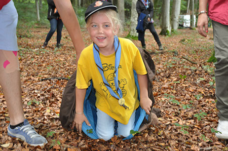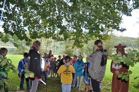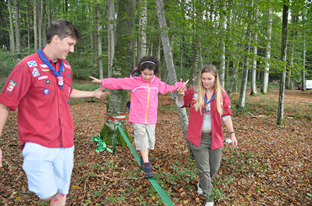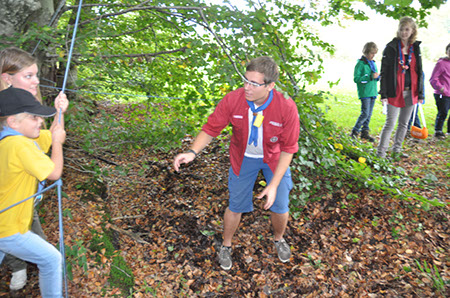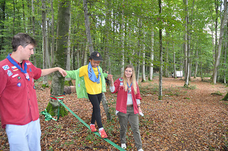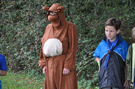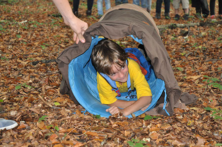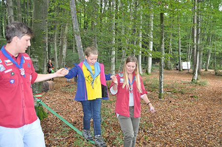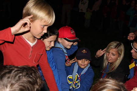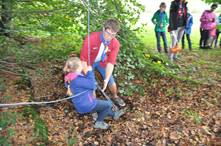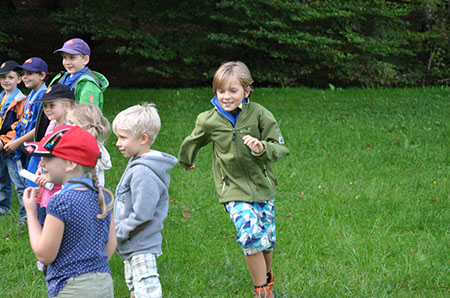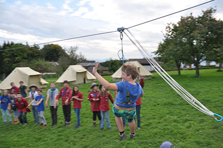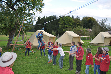 Die Biber wechselten zu den WiWö durch einen engen Tunnel, eine gefährlich schwankende Slackline und zu guter Letzt mit Schwung über einen Graben und wurden dabei von den WiWö sehr lautstark angefeuert.