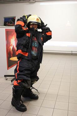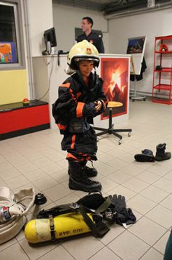 Dann erfuhren wir was denn ein Feuerwehr zum Einsatz alles braucht. Da wären die Schutzkleidung, der Helm, die Sauerstoffflasche, die Handschuhe und der Schlauch. Felix und Arthur schafften es sogar die Ausrüstung in weniger als 45 Sekunden anzuziehen!!