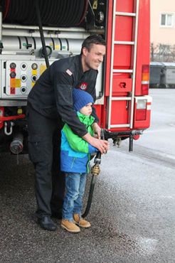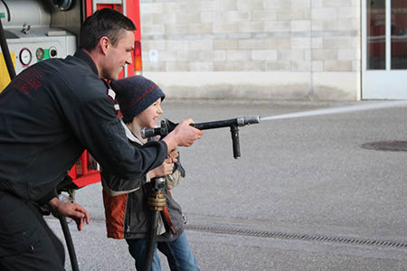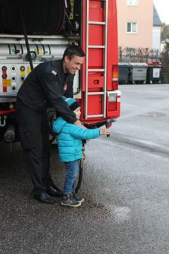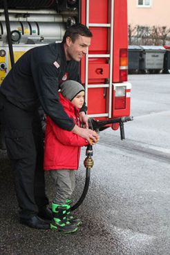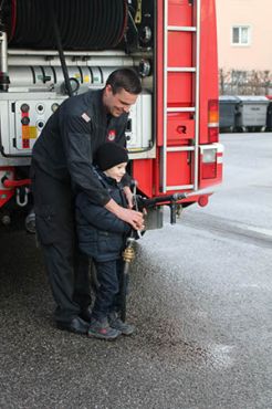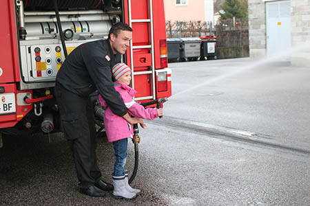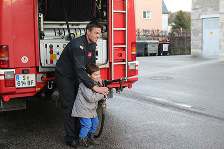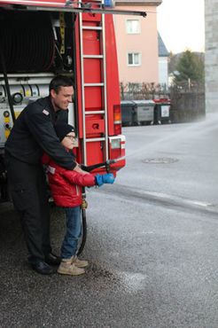 Draußen am Gelände durften wir schließlich mit einem kleinen Feuerwehrauto fahren (natürlich mit Blaulicht und Signalton) und den Schlauch ausprobieren!! Da konnten die Biber gar nicht genug bekommen :-)