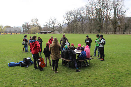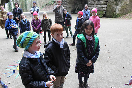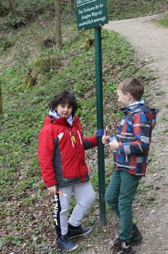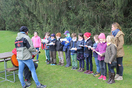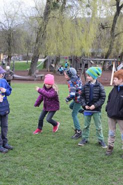 Nachdem sich alle auf dem Spielplatz und bei einer Runde „Komm mit - Lauf weg“ ausgepowert hatten, begann der Weg zum Versprechen von Maja, Pauli und Benni. An der ersten Station kurz hinter dem Spielplatz wurde noch einmal das „Lied vom Anderssein“ geprobt, natürlich erst nachdem alle Kinder ihre selbst bemalten und zum Lied passenden Tücher bekommen hatten.