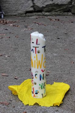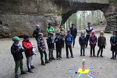 Nach einem kurzen Wegstück wurde vor dem Steintheater noch einmal Halt gemacht. Jeder konnte auf farbigen Strahlen, nun gute Wünsche für die drei Kinder aufschreiben.