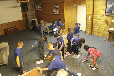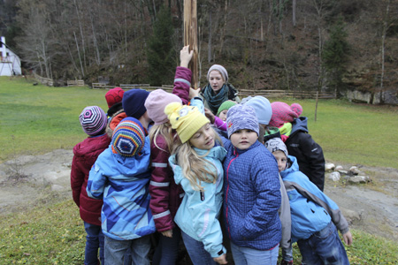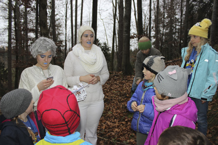 Wir erklärten Ihnen, dass wir bei unserer Bruchlandung Nubilas Icephone verloren hatten und baten sie uns bei der Suche zu helfen. Gemeinsam mit den WiWö machten wir uns auf die Suche und fanden im Wald nicht weit von der Schwaigmühle das Icephone. Mit diesem riefen wir dann die Schneekönigin an um sie um Erlaubnis zu bitten, die Kinder zu testen, ob sie denn wüssten warum auf der Erde nur mehr so wenig Schnee liegt.