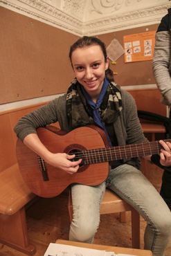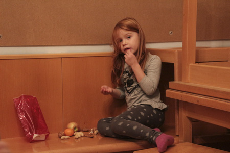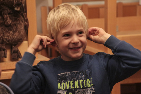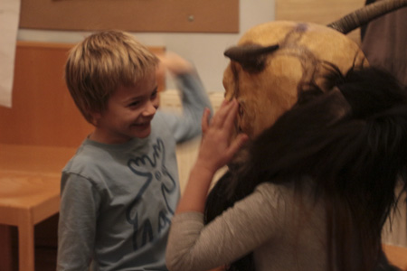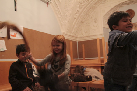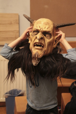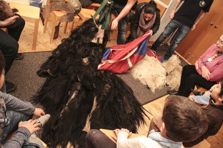Gleich nach dem Biberlied bekamen wir Besuch von 3 Erwachsenen. Alex, Sabrina und Philipp kamen vollbepackt ins Heim, doch was hatten sie mit? Wir konnten ganz viel Fell und Glocken sehen.. Ob das wohl Perchten waren?? Ohne den Masken schauen sie ja gar nicht so unheimlich aus.