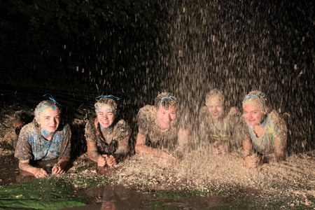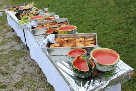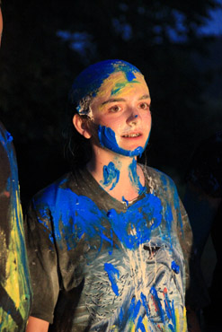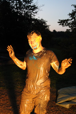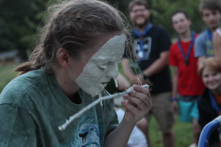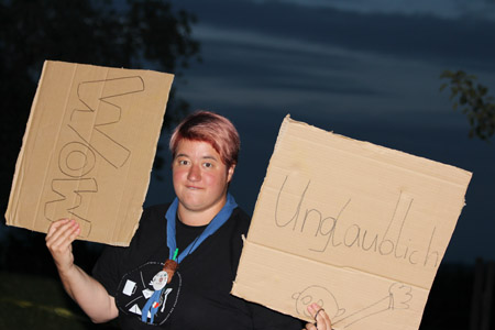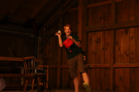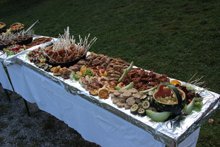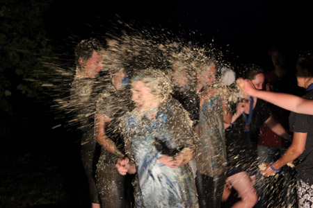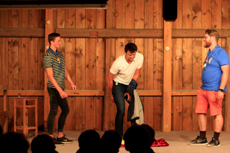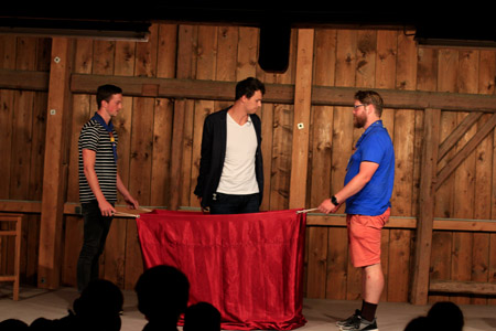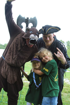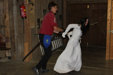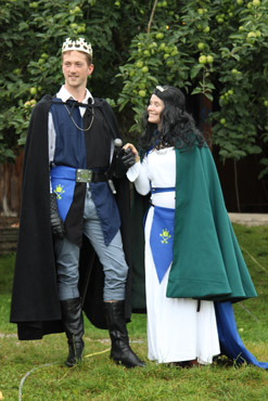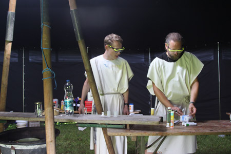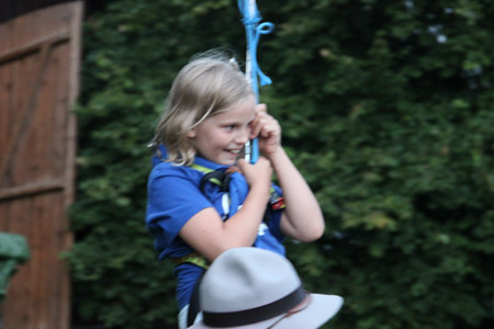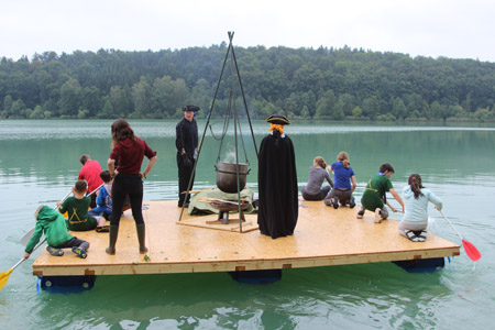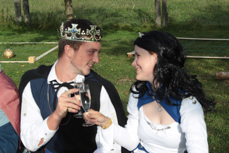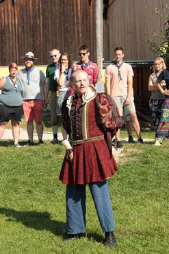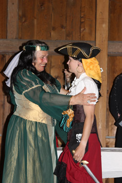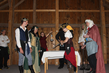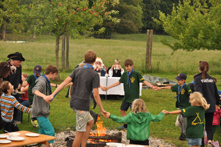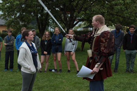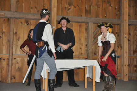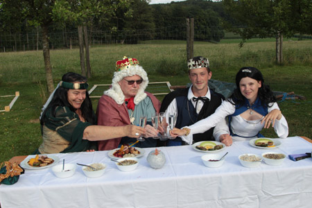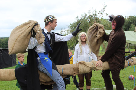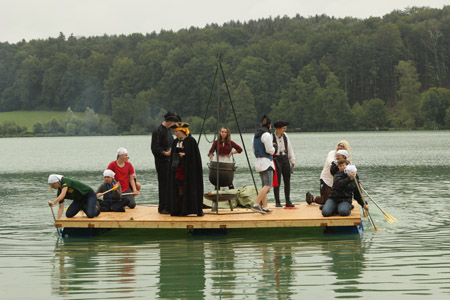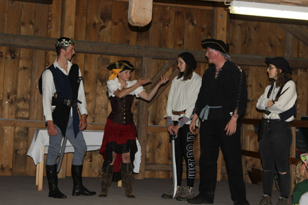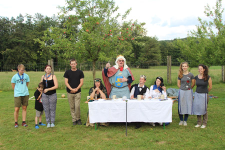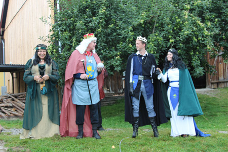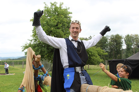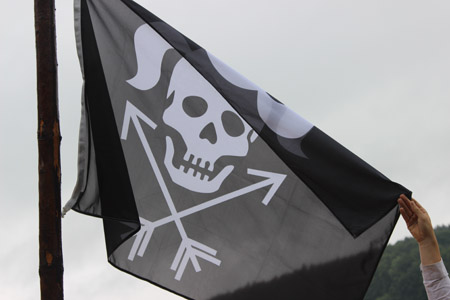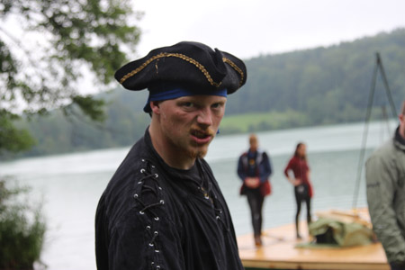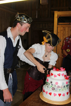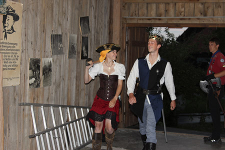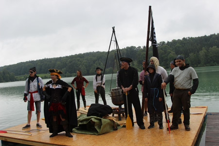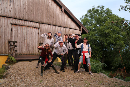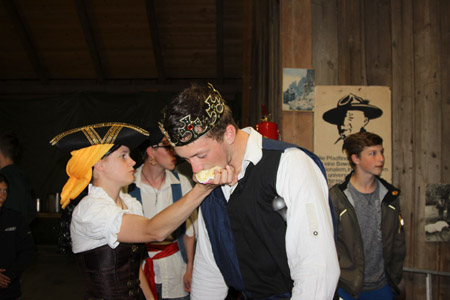 Wenn gefeiert wird, muss es natürlich ein Fest mit Lustbarkeiten und gutem Essen geben. Ins Zentrum des Lagers stellten wir daher für alle von Biber bis RaRo einen Jahrmarkt mit ganz ausgefallenen Stationen und ein Festbankett rund ums Lagerfeuer, für welches sich unser ohnehin geniales Küchenteam selbst übertreffen sollte. Drumherum bauten wir eine Megarahmengeschichte, die sich über vier Tage hinzog. Da ein erklecklicher Teil unseres Leitungsteams fürs Mittelalter was übrig hat, stand die berühmte Landshuter Hochzeit Pate. Das ganze wäre aber noch zu einfach, also mixten wir noch viel Piraterie - Symbol für Freiheit und Abenteuer -, Verwechslungskomik, etwas Schneewittchen und eine Prise Robin Hood dazu: