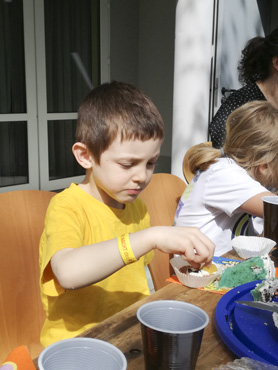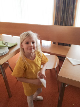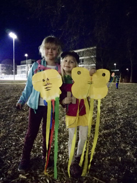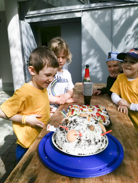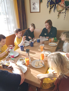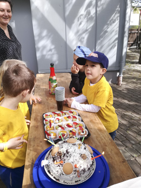 Am nächsten Tag wurde ausgiebig gefrühstückt und das Gepäck wieder zusammengepackt. Da das alles so schnell geklappt hat, hatten wir auch noch Zeit am Krauthügel mit Wind die Drachen steigen zu lassen. Und dann gab es noch eine Überraschung: Leon feierte Geburtstag!! Es gab eine selbstgemachte Weltall-Torte und Kindersekt für alle. Nachdem die Torte zusammen gegessen war, kamen auch schon die Eltern und die Biberübernachtung war schon wieder vorbei.
