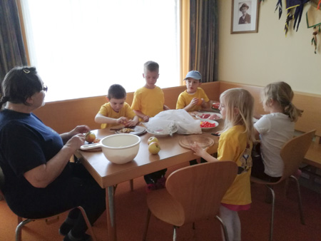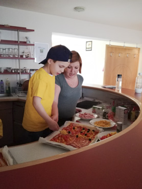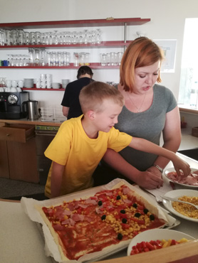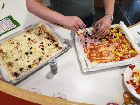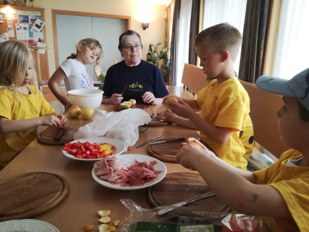 Nachdem die Schlafplätze hergerichtet waren, wurde auch schon begonnen fleißig das Abendessen herzurichten. Schinken, Salami und Paprika wurden geschnitten, um sie später als Belag für die selbstgemachte Pizza zu verwenden. Als Nachspeise gab es selbstgemachten Obstsalat.