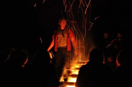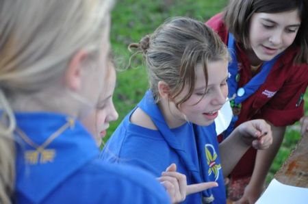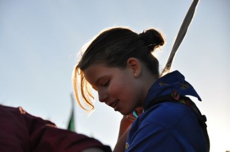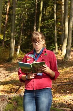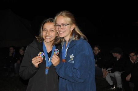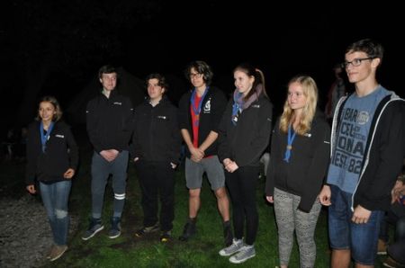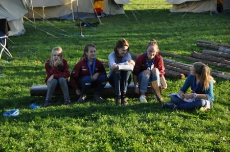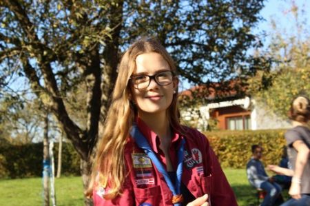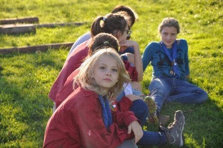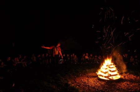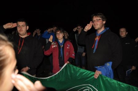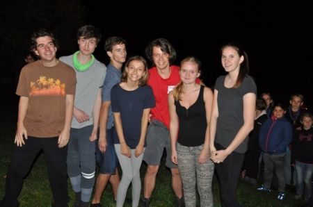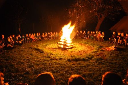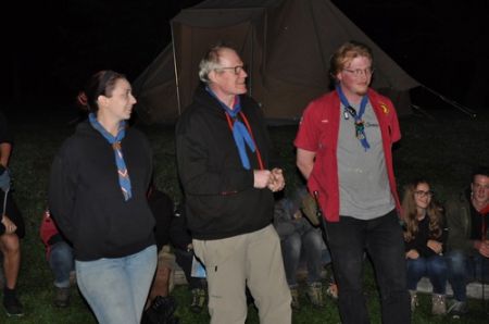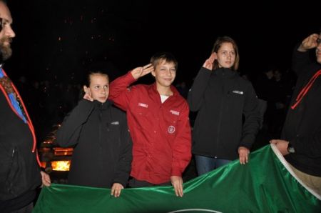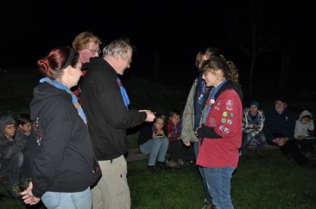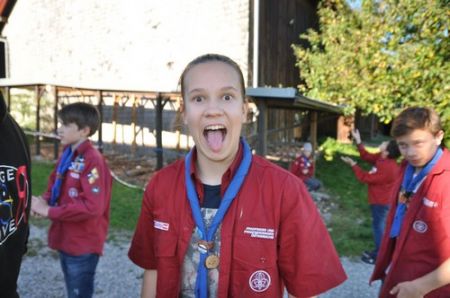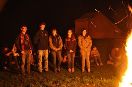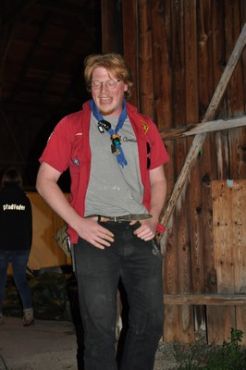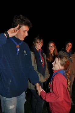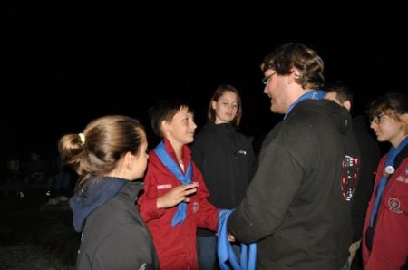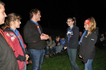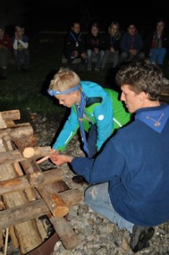 Danach folgte das Abendessen, bei dem wir erneut von unserem Küchenteam verwöhnt wurden. Bis zum Lagerfeuer blieb noch genug Zeit um sich noch besser kennen zu lernen und so ging ein geschäftiges Treiben am Ligglgut um. Als dann endlich Zeit für das Lagerfeuer war, konnte keiner mehr die lang ersehnte Überstellung der CaEx zu den RaRo erwarten. Doch zuvor gab es beim Lagerfeuer noch einige Verleihungen: Die WiWö-Leiter freuten sich das „Tanzende Wichtel“, die höchste Auszeichnung für ein Wichtel, an Jara verleihen zu dürfen. Bei den GuSp haben Emma, Gloria und Tobi ihr Pfadfinderversprechen abgelegt und Chrissi und Vicky das Spezialabzeichen „Beschleichen“ verliehen bekommen. Der 2.Kreis wurde bei den CaEx Tamina und Flora verliehen. Außerdem erhielten die CaEx-Leiter, vor allem Nadja, von ihren noch CaEx ein kleines Geschenk für die letzten 3 tollen Jahre. Und Laura und Anna-Lena bekamen die „RaRo-Wache“ verliehen, die sie in der Nacht zuvor absolviert hatten.