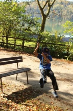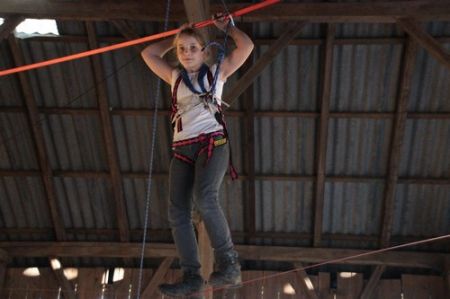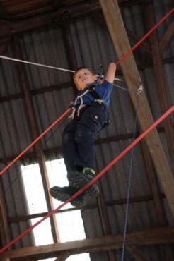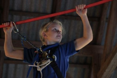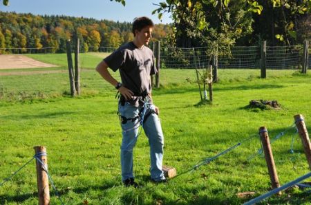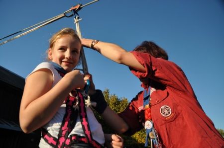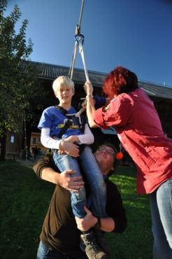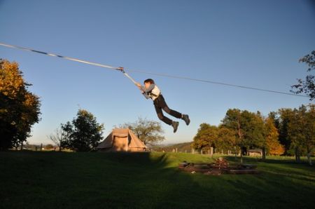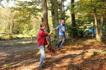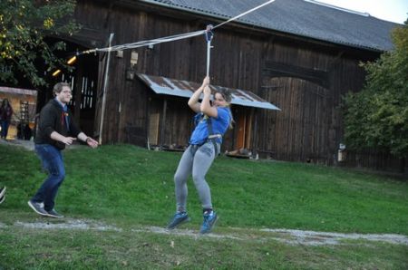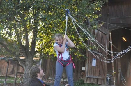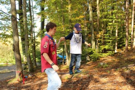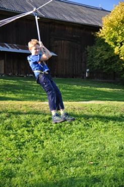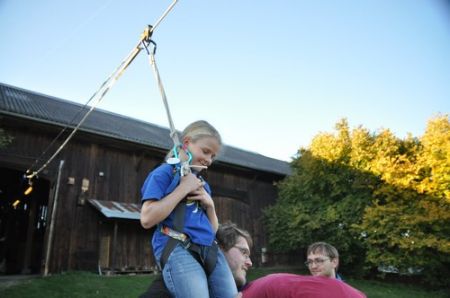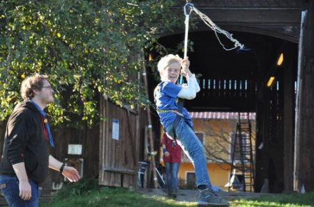 Kurz darauf ging es auch für die ältesten WiWö los – über eine Slackline in luftiger Höhe, ging es zu einer langen Seilrutsche, an dessen Ende sie von den GuSp fröhlich empfangen wurden. Auch wenn alle gut gesichert waren, konnte man die Anspannung in den Gesichtern der Kinder nur zu deutlich erkennen. Diese wich aber einem freudigen und stolzen Grinsen, nachdem sie die Seilrutsche überstanden hatten.