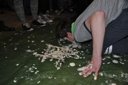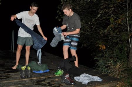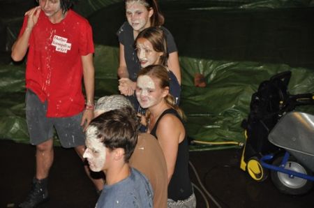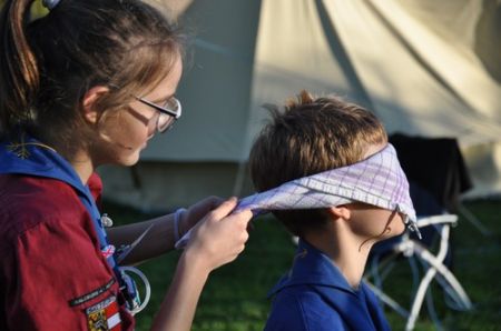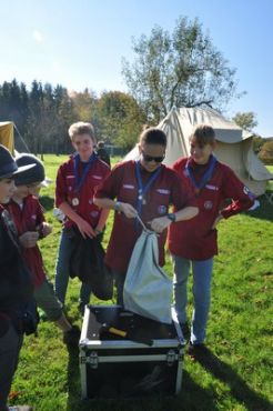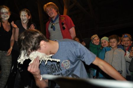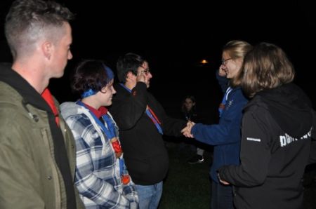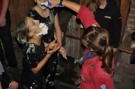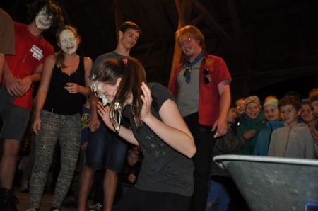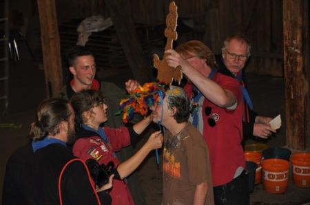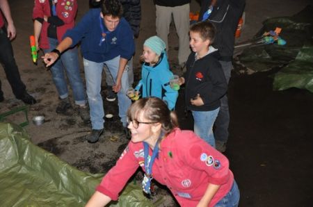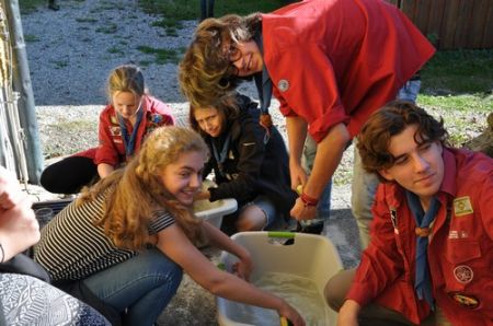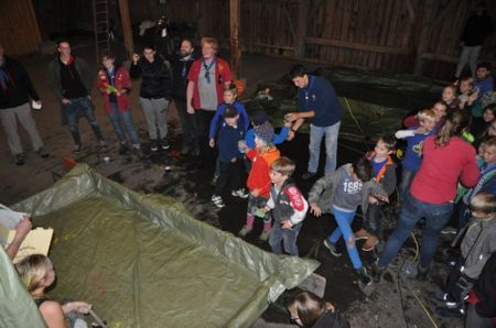 Nach einem ruhigen und entspannenden Lagerfeuer mit einigen neuen Liedern, die Armin uns beibrachte, begann auch schon die RaRo-Überstellung. Die Anwärter mussten alle zuvor absolvierten Altersstufen in Form von Aufgaben bewältigen. Zunächst galt es einen Biberdamm aufzubauen. Danach wurde das Wecklied der WiWö mit vollem Körpereinsatz nachgestellt. Bei der GuSp-Station wurden sie wie ihre Teller gewaschen und um die CaEx-Station zu meistern wurden die Anwärter in Kekse verwandelt.
