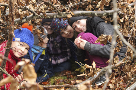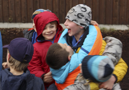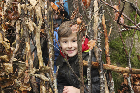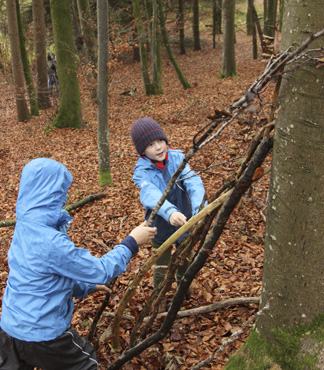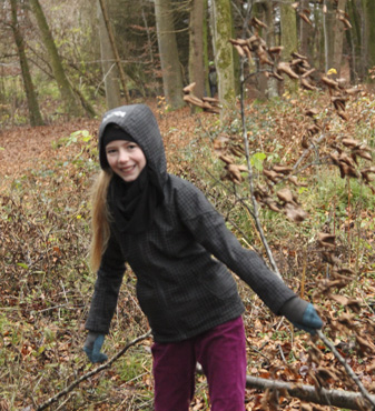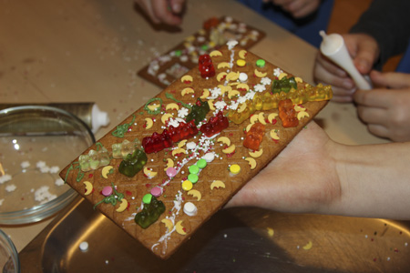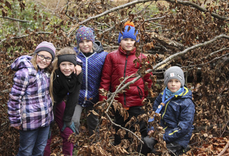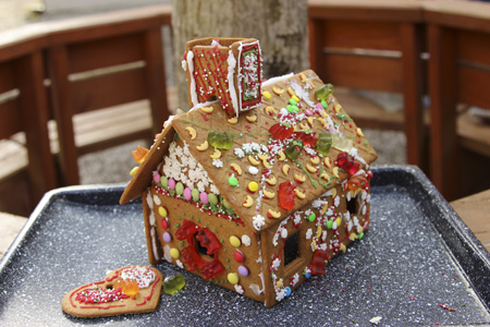 Gestärkt von der warmen Suppe und von leckerem Grießbrei, machten wir uns auf den Weg in den Wald. Eingeteilt in 3 Teams und dem mittlerweile regnerischen Wetter trotzend, wurden Waldhütten gebaut. Die Waldhütten waren die erste Disziplin der Wettkämpfe. Für die Jury standen Teamwork, Kreativität und Effizienz im Vordergrund für die Bewertung. Als nächstes wurde Halstuchstehlen gespielt und die Teams nutzten ihre Waldhütte als Basis. Obwohl alle großen Spaß hatten, mussten wir auch diesmal früher den Rückzug ins warme Haus antreten. Die nassen Jacken und Hosen, wurden gegen gemütliche Jogginghosen und warme Pullover getauscht, es gab warmen Tee und der nächste Programmpunkt sollte etwas ganz Besonderes werden. Im Aufenthaltsraum war schon alles für das etwas andere basteln vorbereitet. Es wurden Lebkuchenhäuser und Figuren verziert und „zusammengeklebt“. Zum Glück fällt da immer etwas zum Naschen ab ;-) .