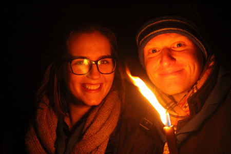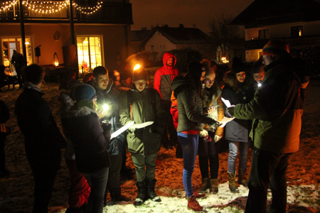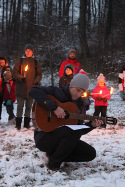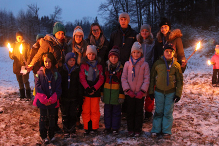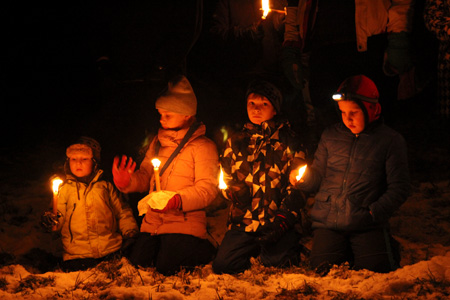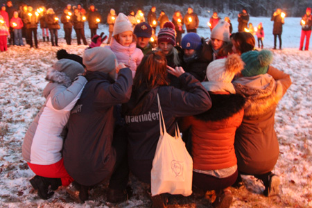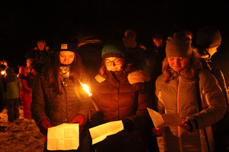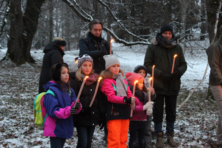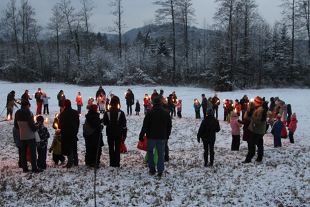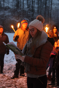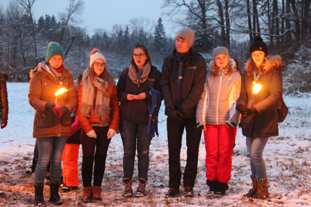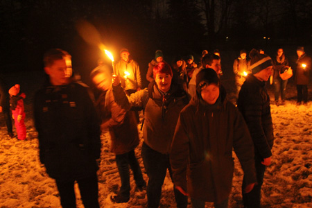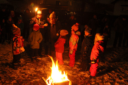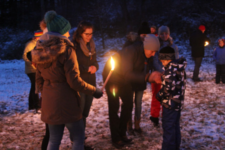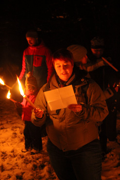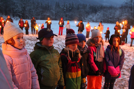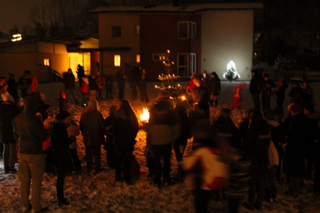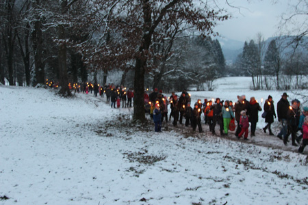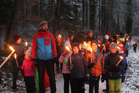 Am Weg erwarteten uns 4 Stationen bei denen Lieder gesungen, Geschichten erzählt, Salzteigkekse verteilt, und Geschenke verteilt wurden. So hatten trotz einstündiger Wanderung und der Kälte alle Spaß, gerade die Kleineren unter uns hatten viel Freude daran miteinander durch den Schnee zu stapfen, die Schatten der brennenden Fackeln zu beobachten und den spannenden Beiträgen der anderen Stufen zu lauschen.