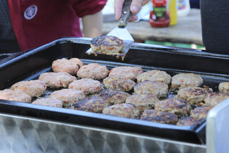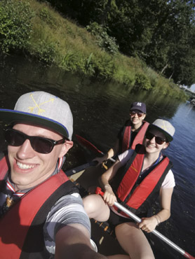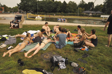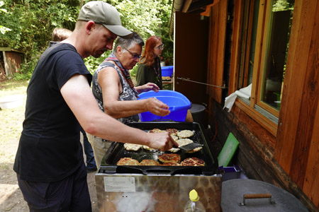 Anderntags paddelten wir im Brackwasser - zu weit, weil selbst im Einbahnkanal Navigation schwierig sein kann. Kein Problem, unsere Haubenlagerküche reiste uns überall hin nach und lieferte Essen auf Rädern: Fleischlaberl - pardon! -Hamburger. Da einige Kilometer von uns entfernt in diesen Tagen der deutsche Hitzerekord aufgestellt wurde, gab es Sonnenbrände und Sonnenstiche als Draufschlag.