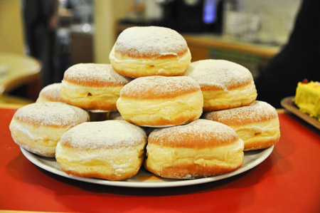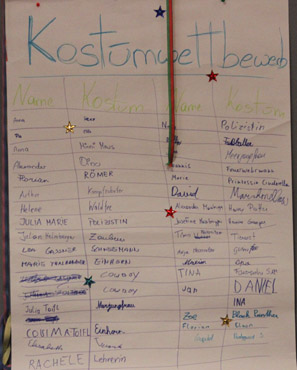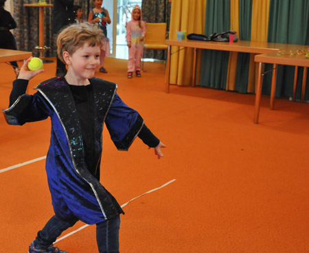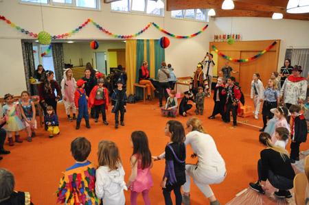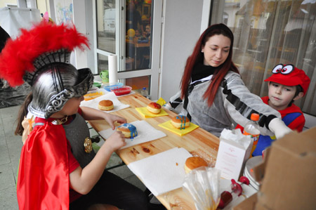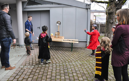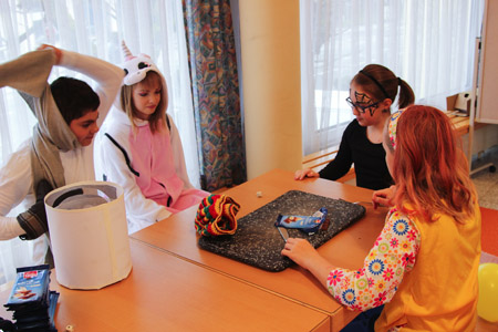 Für ausreichend Verpflegung war natürlich auch gesorgt! Abgesehen von den selbstgestalteten Krapfen gab es noch genug andere Dinge auszuprobieren, beispielsweise Brownies, Pizzaschnecken oder leckeren Kuchen. Wer es nicht ganz so einfach mag und lieber mit einer kleinen Challenge an sein Essen kommt, konnte an dem Schwedenbomben-Katapult sein Können und Geschick unter Beweis stellen. Zwischendurch haben alle die Lust hatten in einer großen Runde zusammen den Hubschraubereinsatz gemacht, oder sind kurzzeitig zu Schimpansen geworden. Den krönenden Abschluss des Tages bildete ein Kostümwettbewerb, bei dem jeder unserer einzigartigen Gäste sich präsentieren konnte. Der erste Platz wurde per professioneller Lautstärke Messung ermittelt und ging an einen Schneeman. Gratulation Frau Schneemann!