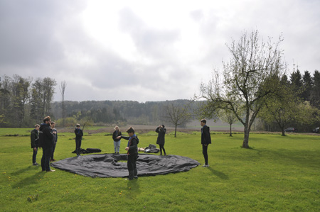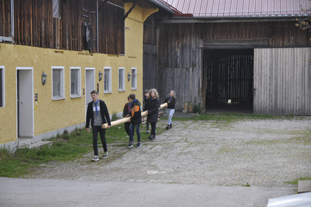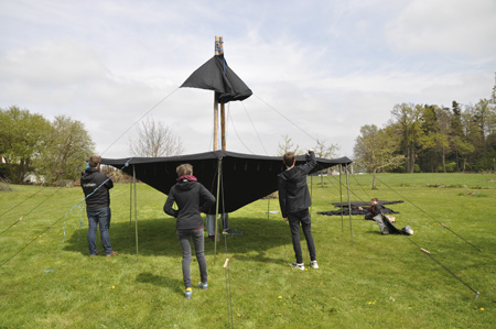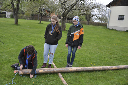 Am nächsten Tag wurden nach einem verhältnismäßig frühen Frühstück erst mal die neuen Stangen für unseren Stand in Hellbrunn weggeräumt und anschließend die kleine Jurte aus dem Zeltlager befördert. Das schnelle aufstellen, abspannen und danach Essen lief dann doch etwas anders als erwartet. Die Erinnerungen an das letzte Jurte aufbauen waren ein bisschen eingerostet und das Bünde setzen auch schon ein paar Lager her, aber nachdem alle mitangepackt hatten, stand pünktlich zum Mittagessen wenigstens das Dach.