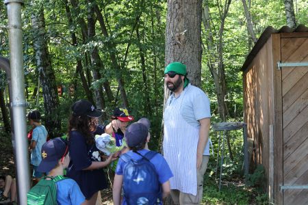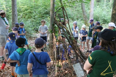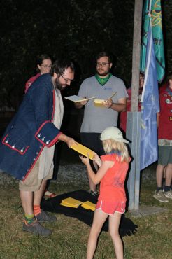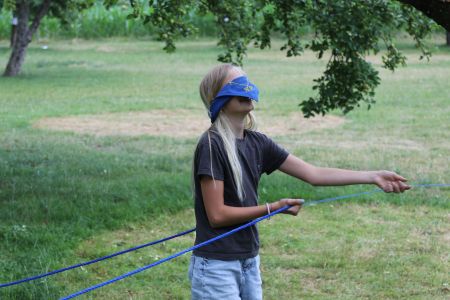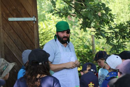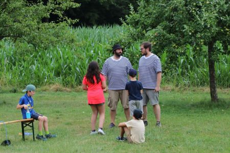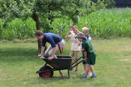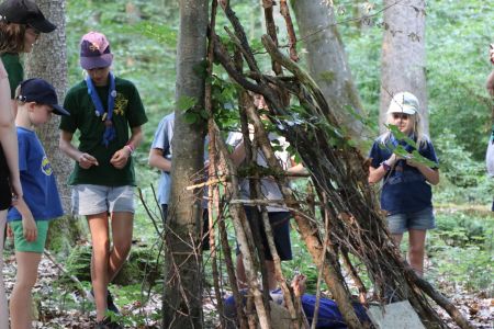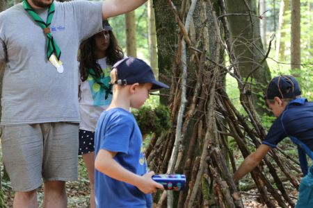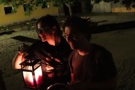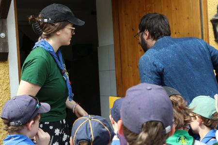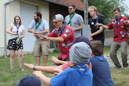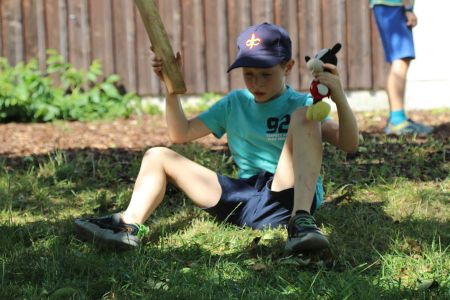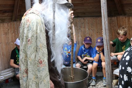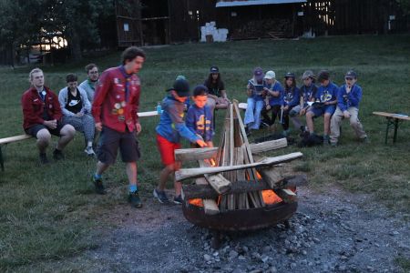 Nach einem erfrischenden Bad im Höllerersee am Nachmittag machten sie sich auf den Weg, um der ersten Prophezeiung zu folgen. Tapfer folgten sie einer Brotspur, die sie zu Hänsel und Gretel führte. Doch plötzlich endete die Spur, weil die drei kleinen Schweinchen die Brotkrümel verschlungen hatten. Um den weiteren Weg zu finden, halfen die WiWö, feste Unterschlüpfe für die Schweinchen zu bauen. Der Abend verging in fröhlichem Spiel und gegenseitigem Kennenlernen.