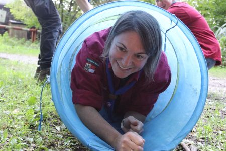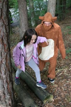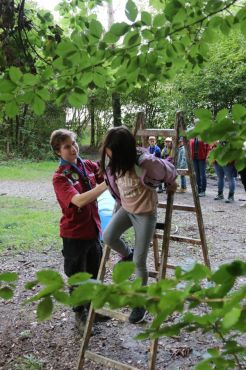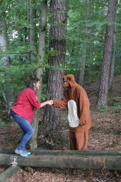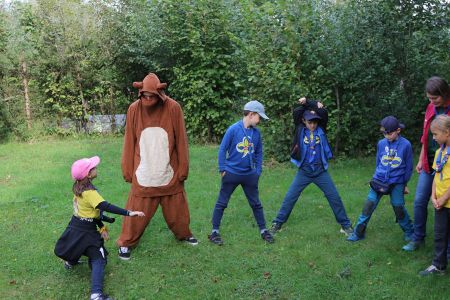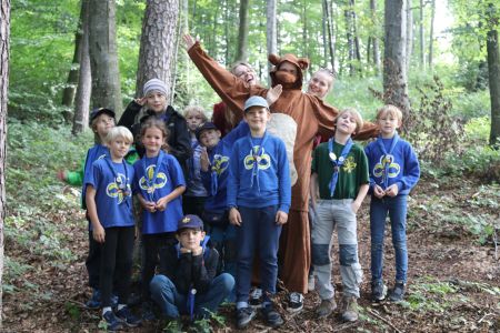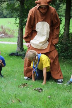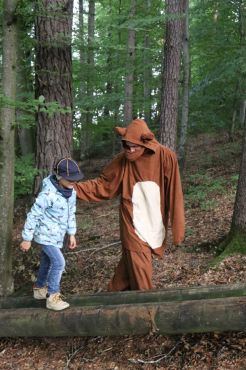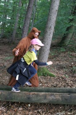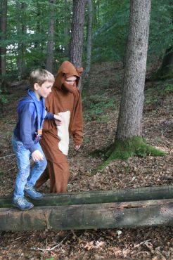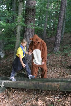 Nun sind 6 Biber und eine Biberleiterin dran – auch sie werden überstellt. Nach einer letzten Verabschiedung durch die verbleibenden Biberleiterinnen machen sie sich mit Balus Hilfe auf den Weg zu den WiWö. Dafür verlassen sie den Biberbau, klettern und balancieren durch den Wald um dann – ENDLICH – im Dschungel anzukommen.